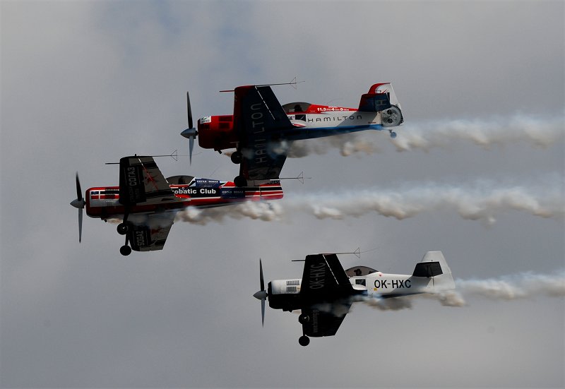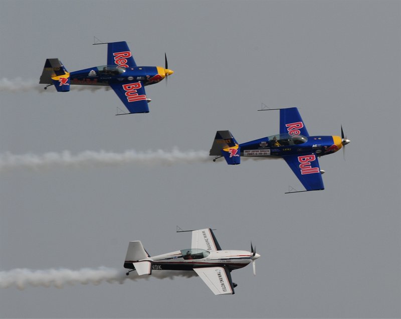 エクストラ勢(左2枚)とスホーイ勢(右2枚)に分かれて航過飛行。