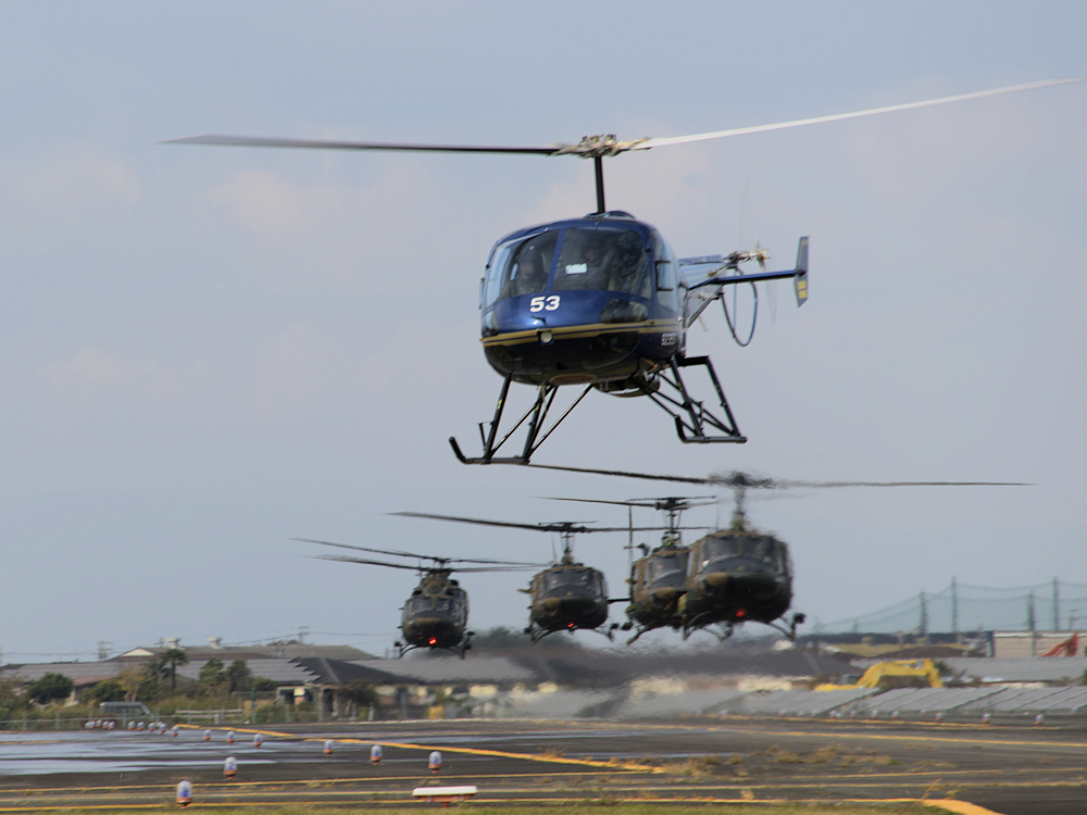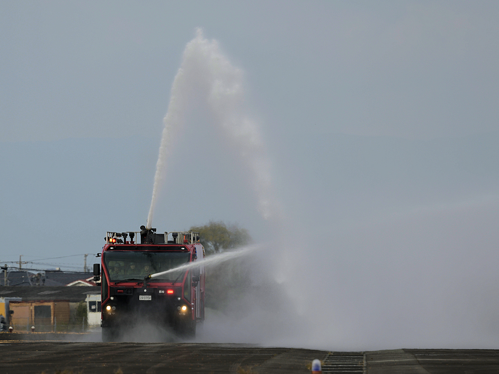 観閲編隊は明野レインボー参加機と分かれて、着陸体勢に。着陸機が戻ってくるまでの間、化学消防車グローバルストライカーが放水デモ(右)。