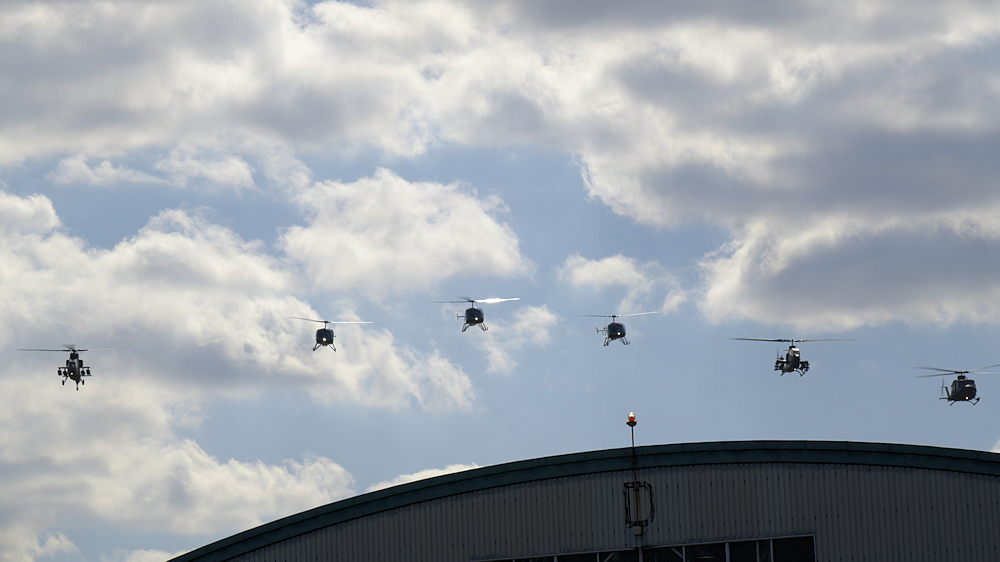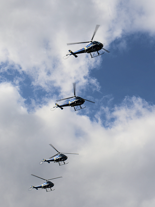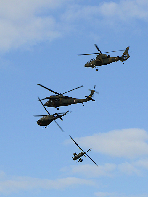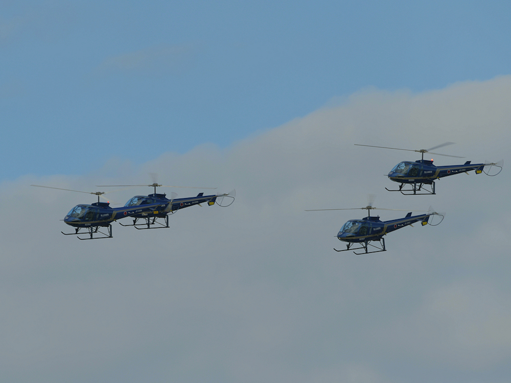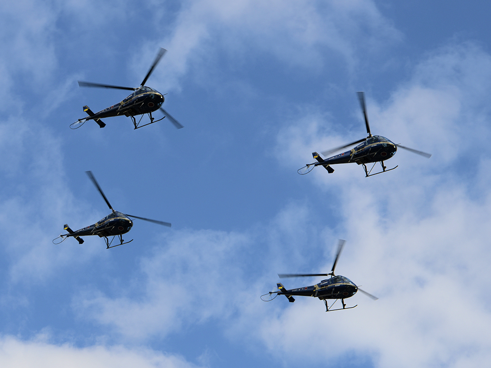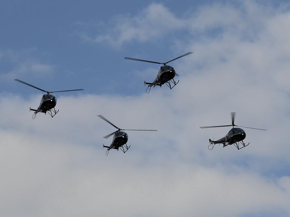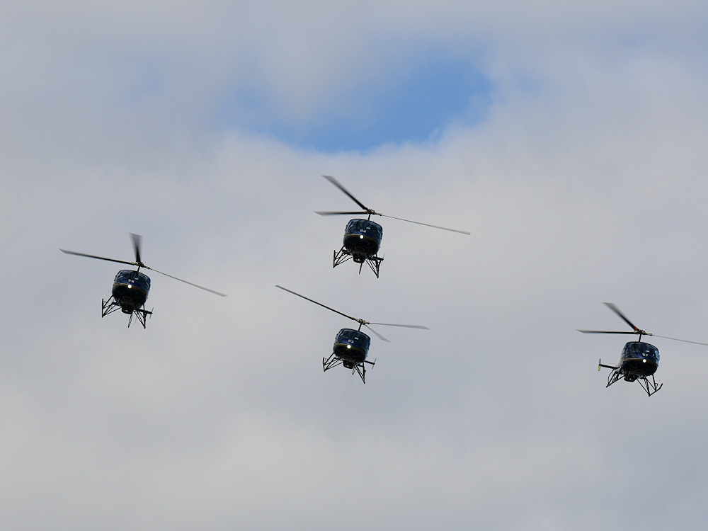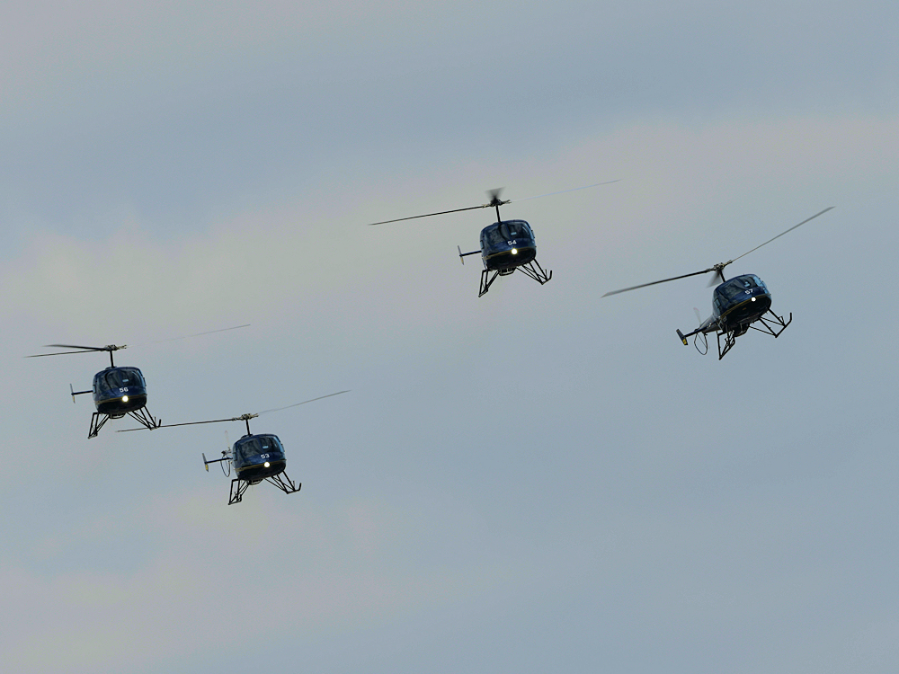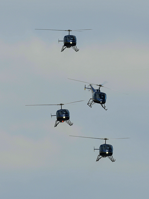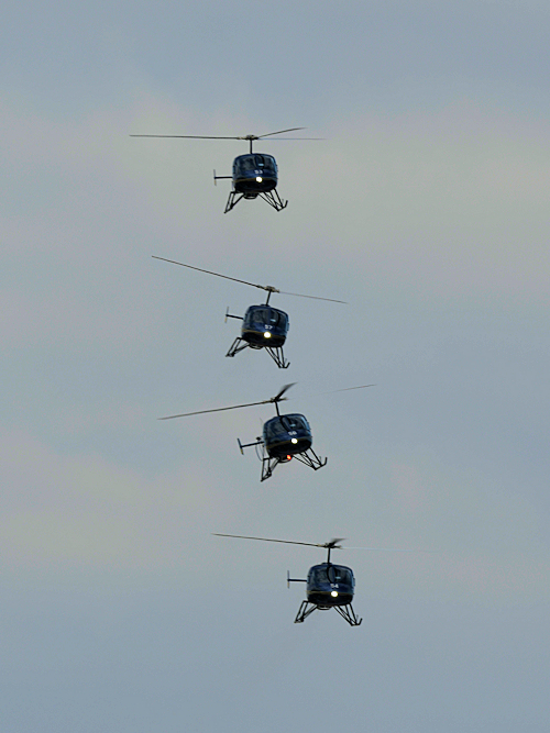 正面からトレイルで進入してきたTH-480B 4機が旋回しつつダイヤモンド編隊に移行。いわゆるチェンジ・オーバー・タ−ンです。