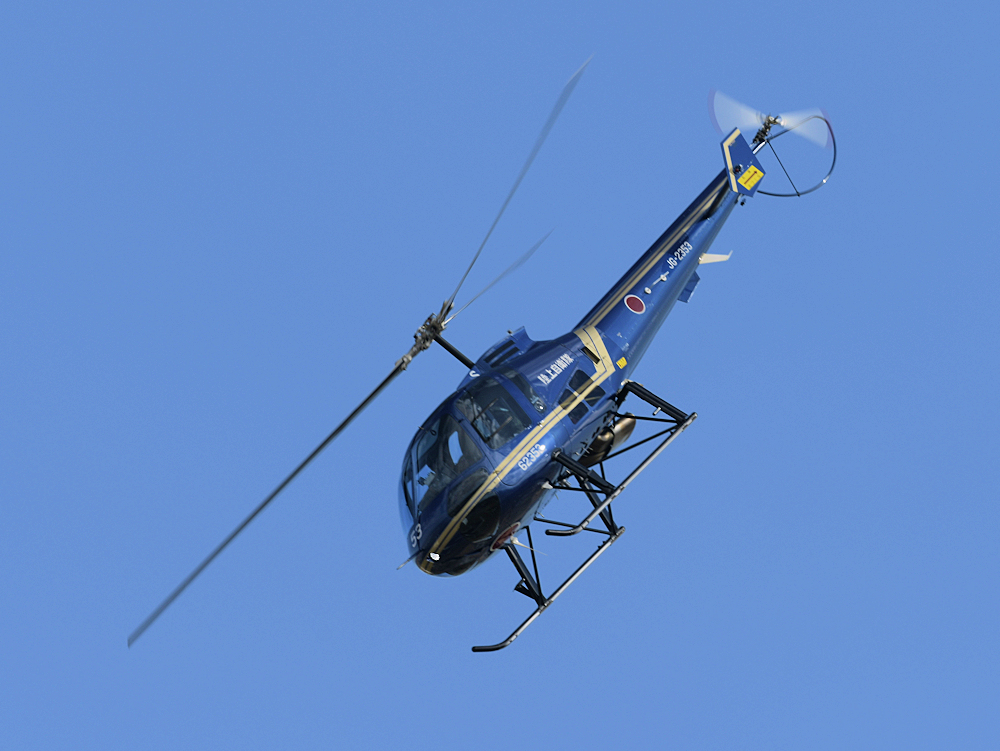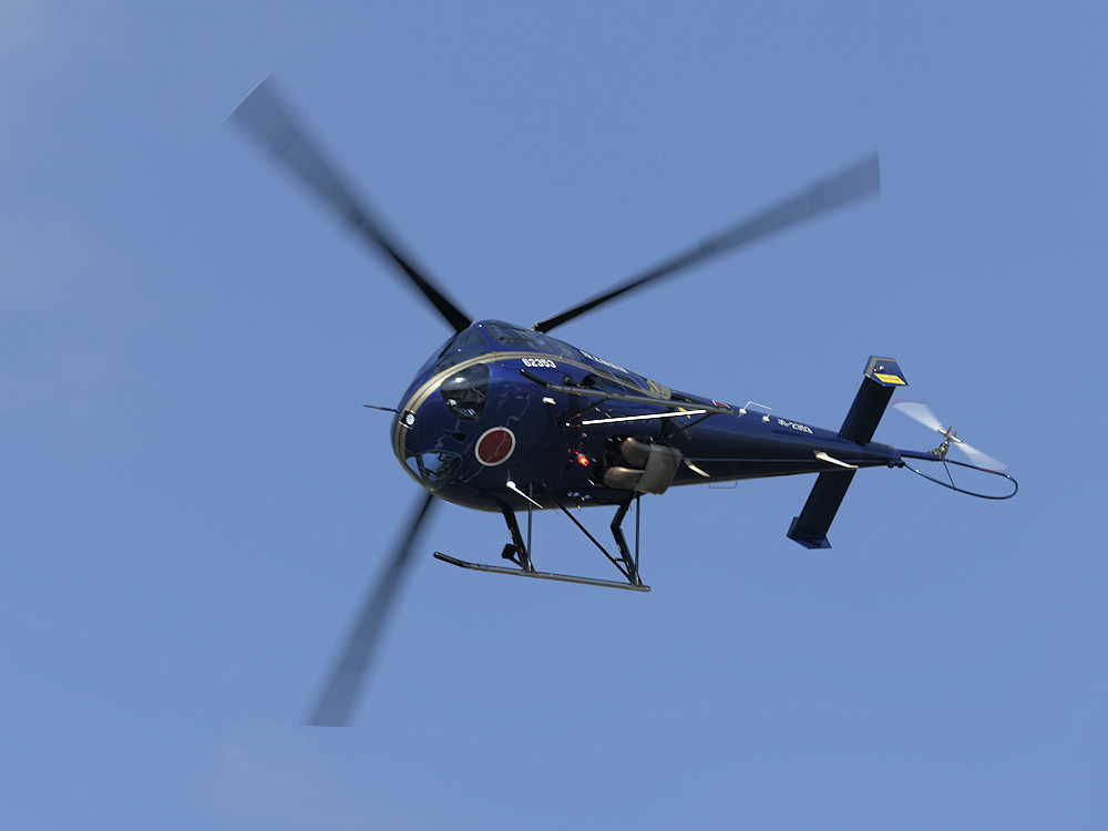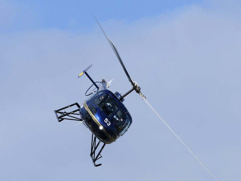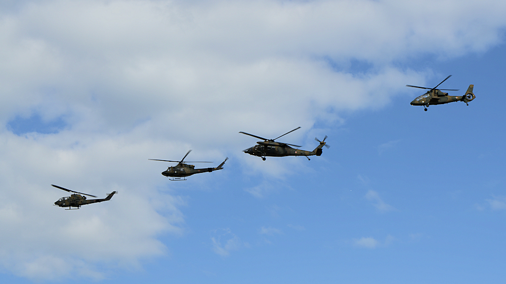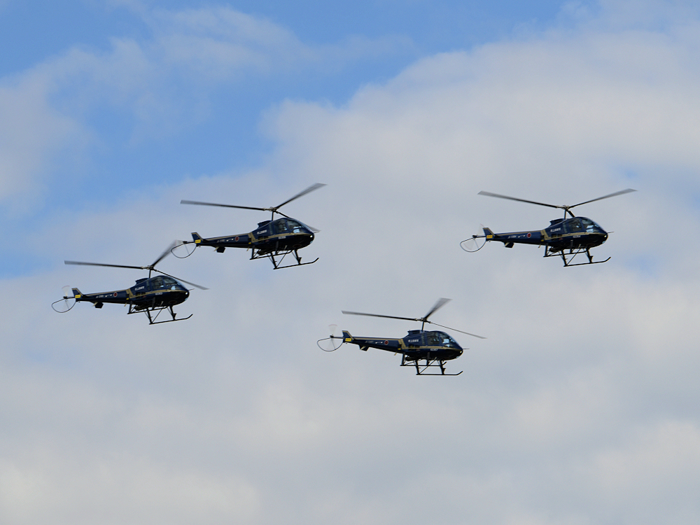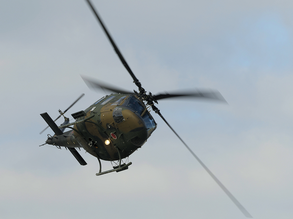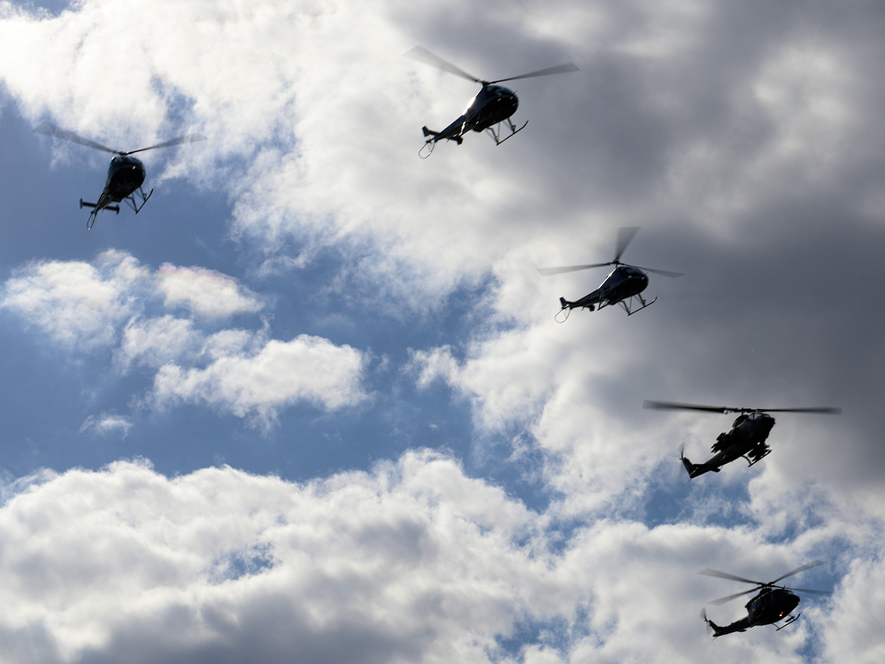 正面からトレイルで進入してきたTH-480B 4機が旋回しつつダイヤモンド編隊に移行。いわゆるチェンジ・オーバー・タ−ンです。