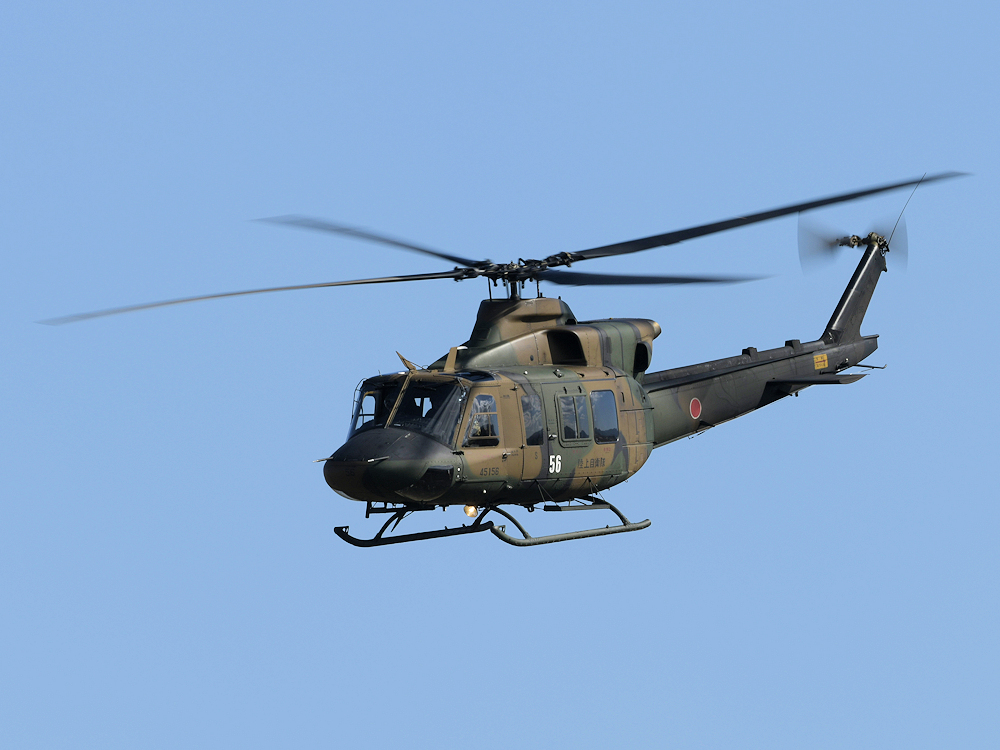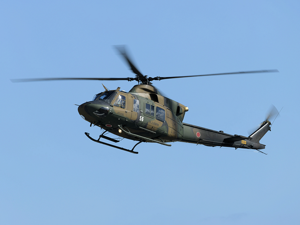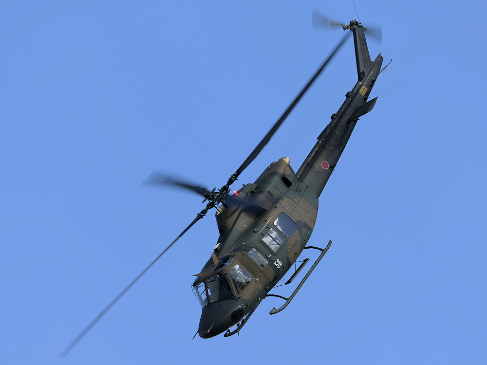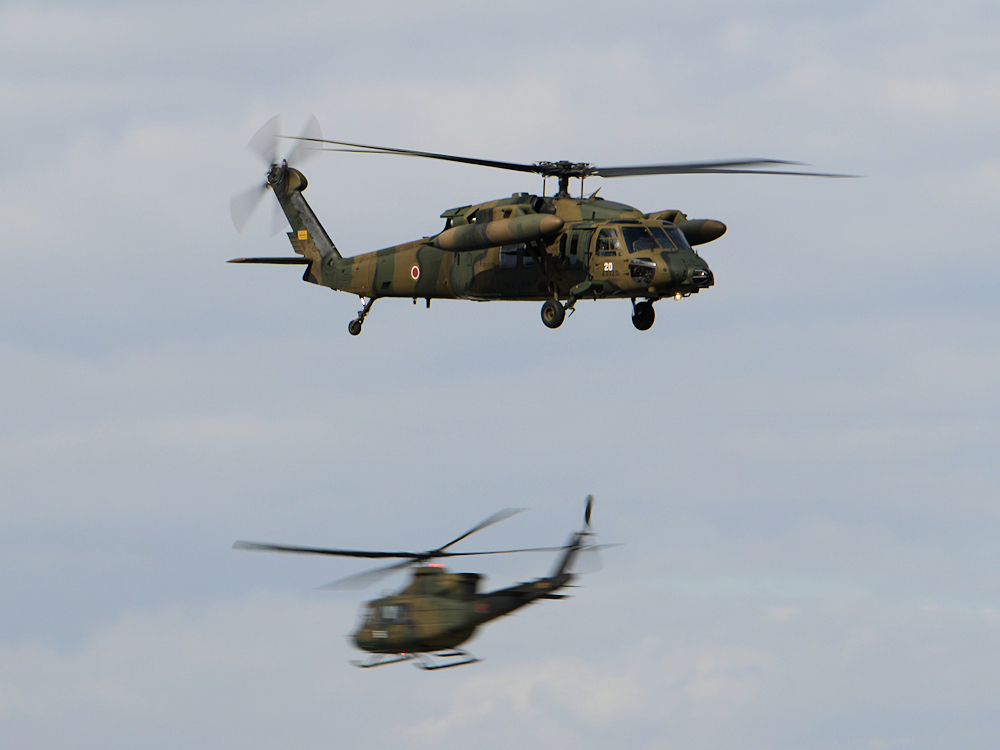 いよいよ明野レインボーの展示飛行。V字編隊から分かれたUH-60とUH-2が対抗進入し、滑走路中央付近で交差。