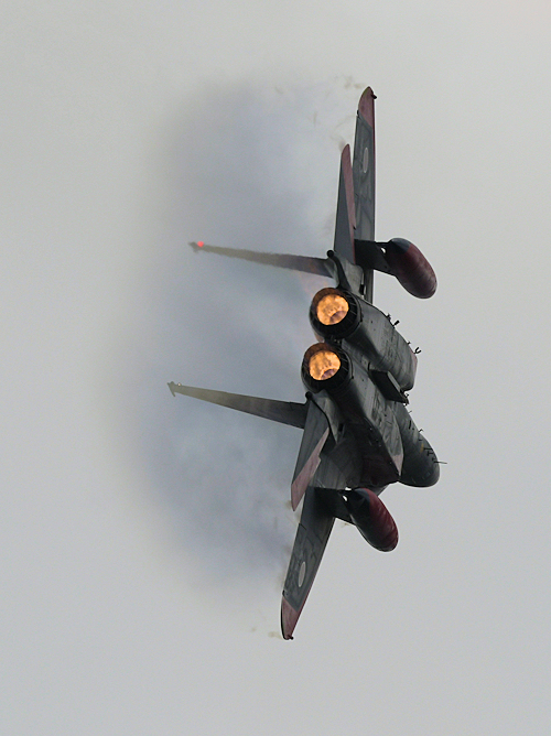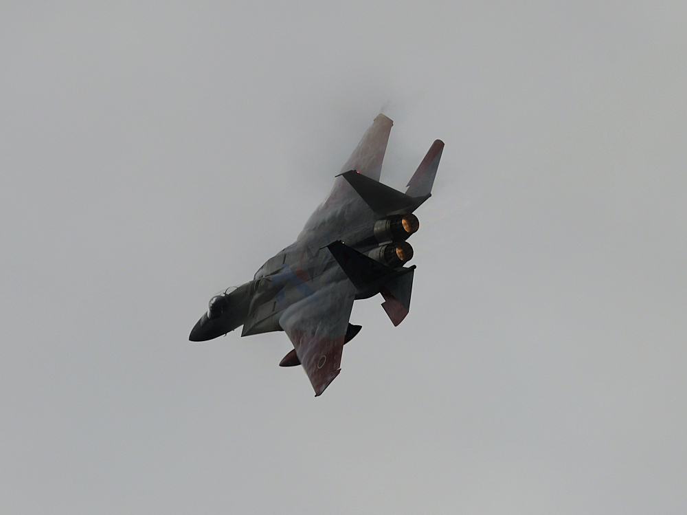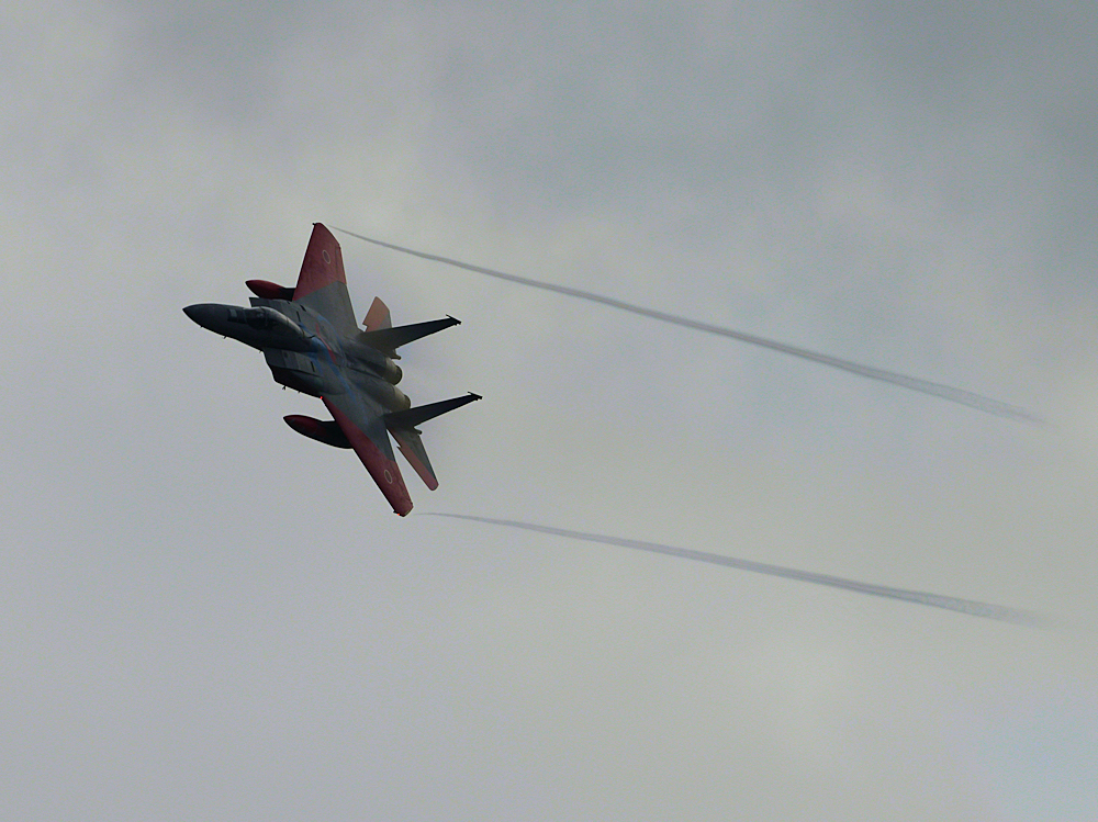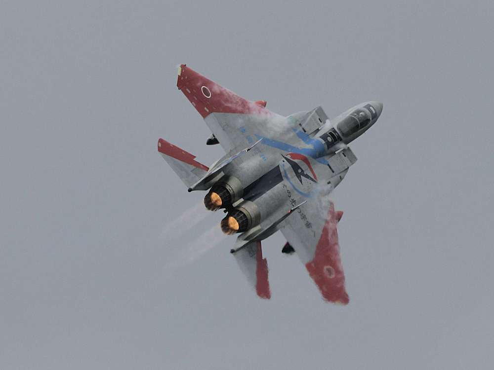 2機でファンブレイクを行ったのち、F-15Jが機動飛行を開始。天候のため、盛大にベイパーが発生するので、せっかくの記念塗装がほとんど見えません。 |