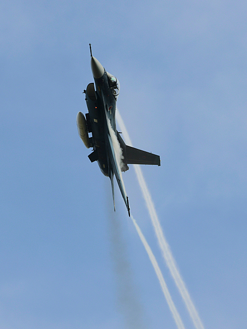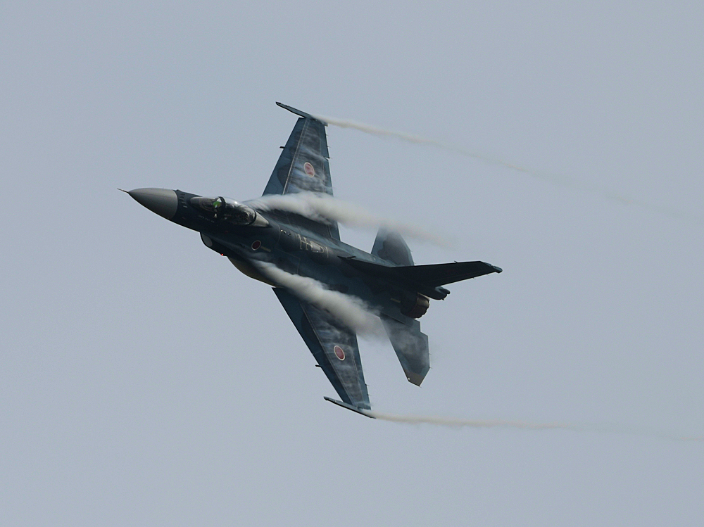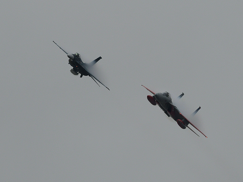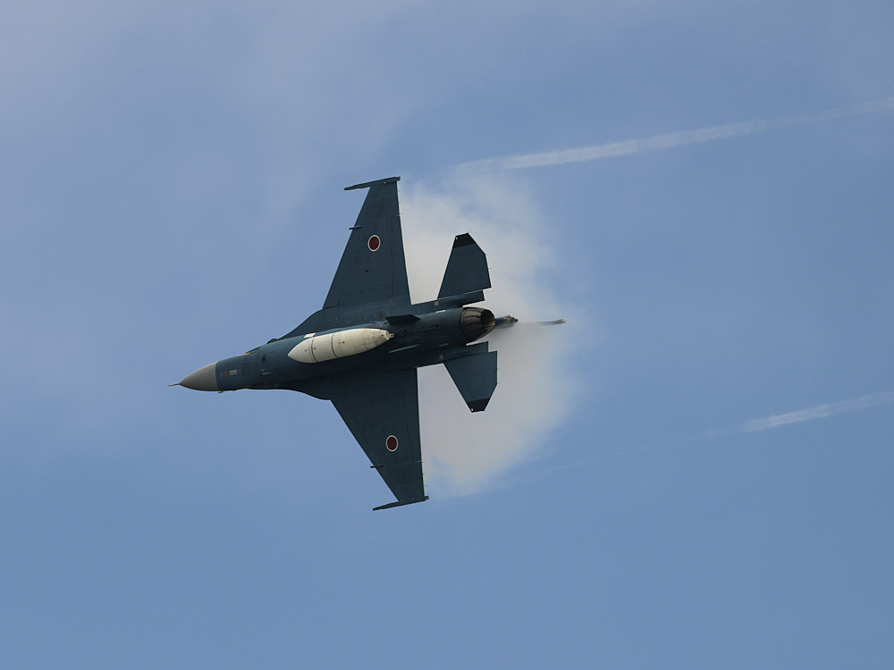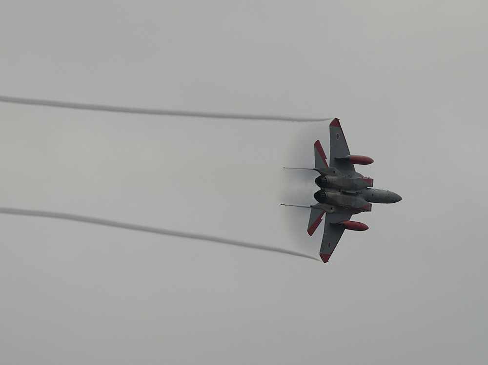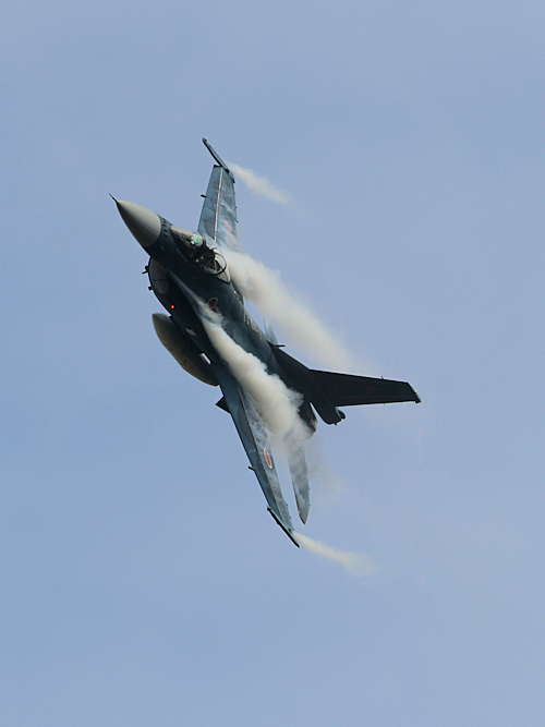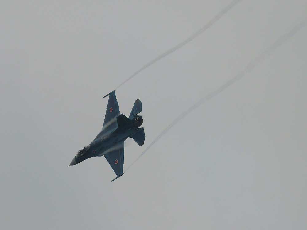 F-15Jが離脱し、F-2Aが進入し、機動飛行を開始。こちらも盛大にベイパーを発し、包み込まれて、雲に紛れて見失うことも。 |