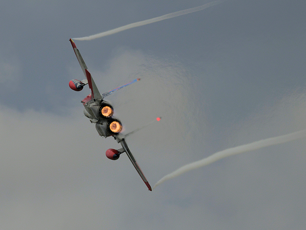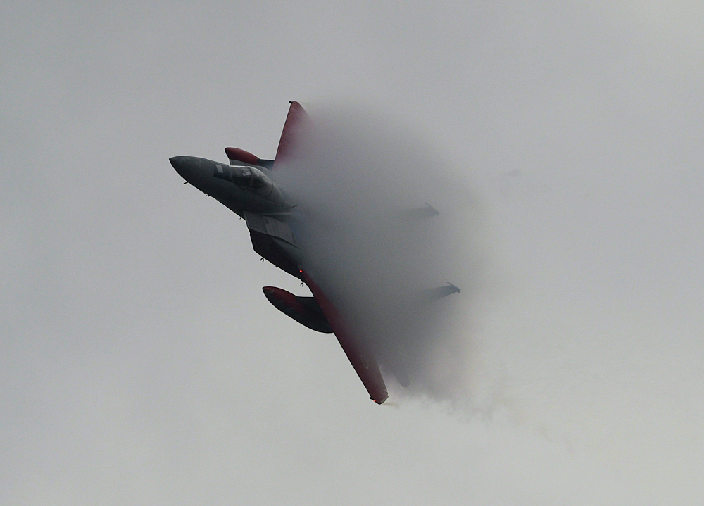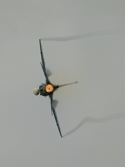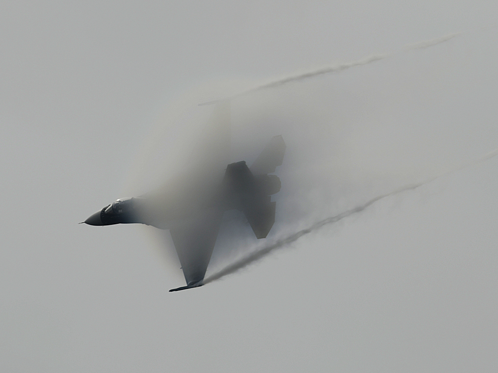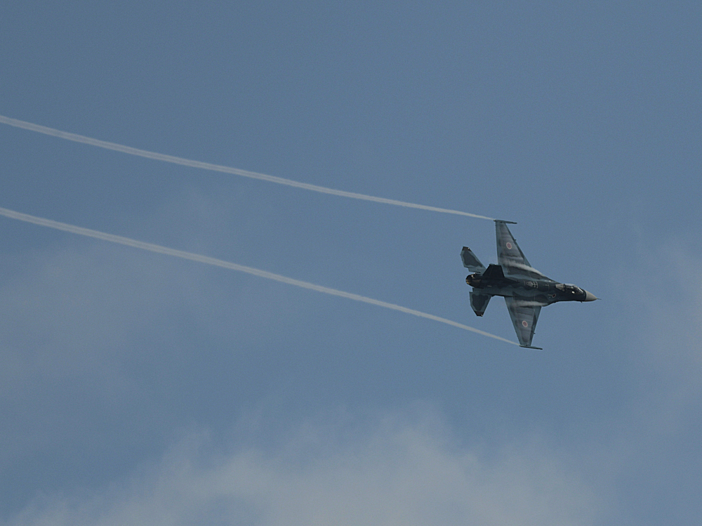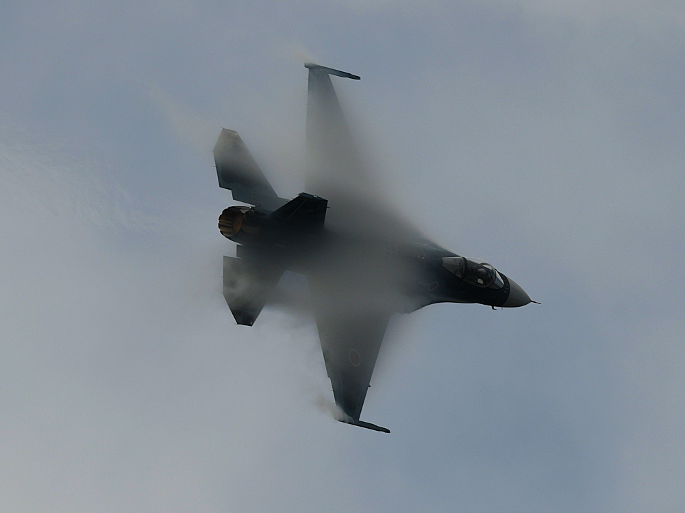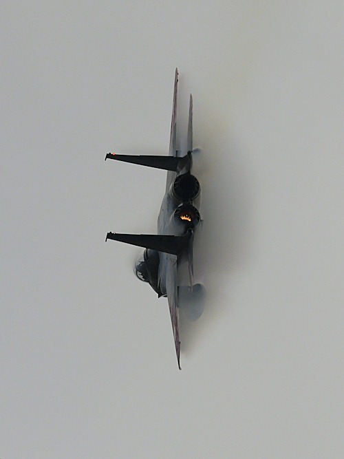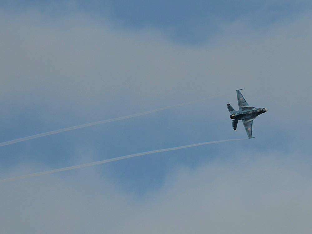 F-15Jが離脱し、F-2Aが進入し、機動飛行を開始。こちらも盛大にベイパーを発し、包み込まれて、雲に紛れて見失うことも。 |