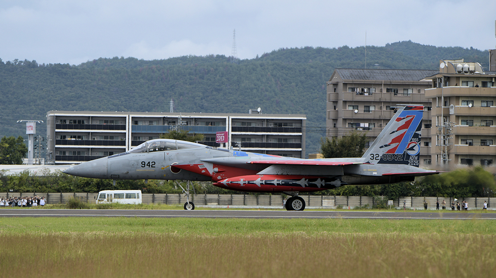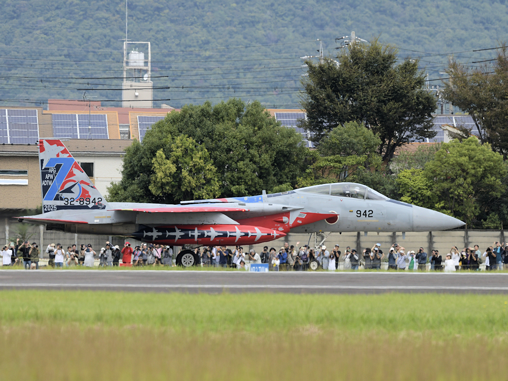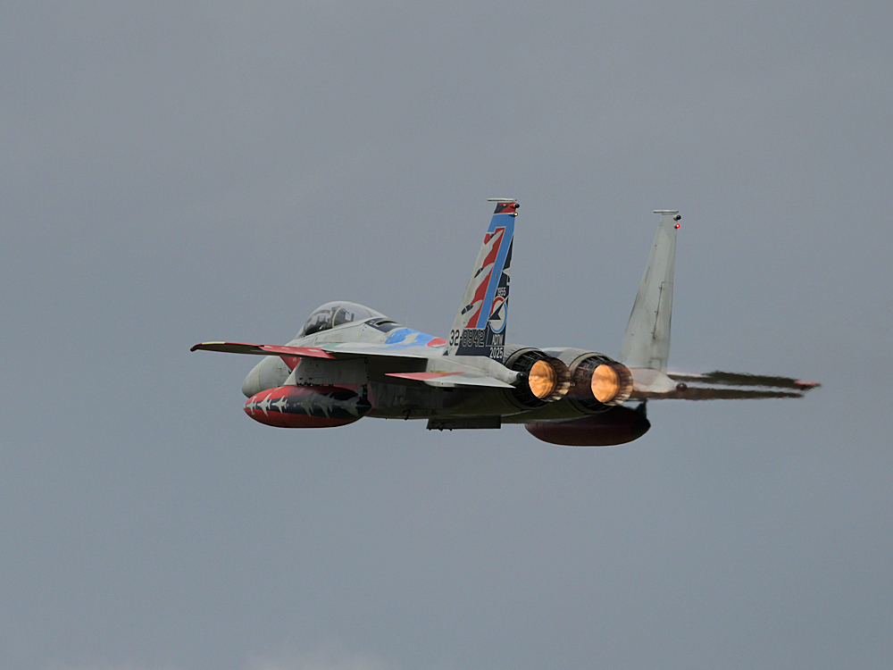 ハイレート・クライムを行う予定だったと思うのですが、天候により「通常」の離陸を実施。まずはF-2Aが「通常」どおりに離陸。続いて、F-15Jがこちらも「通常」どおりに離陸。F-15Jはもちろん飛行開発実験団開設70周年記念塗装機です。 |
