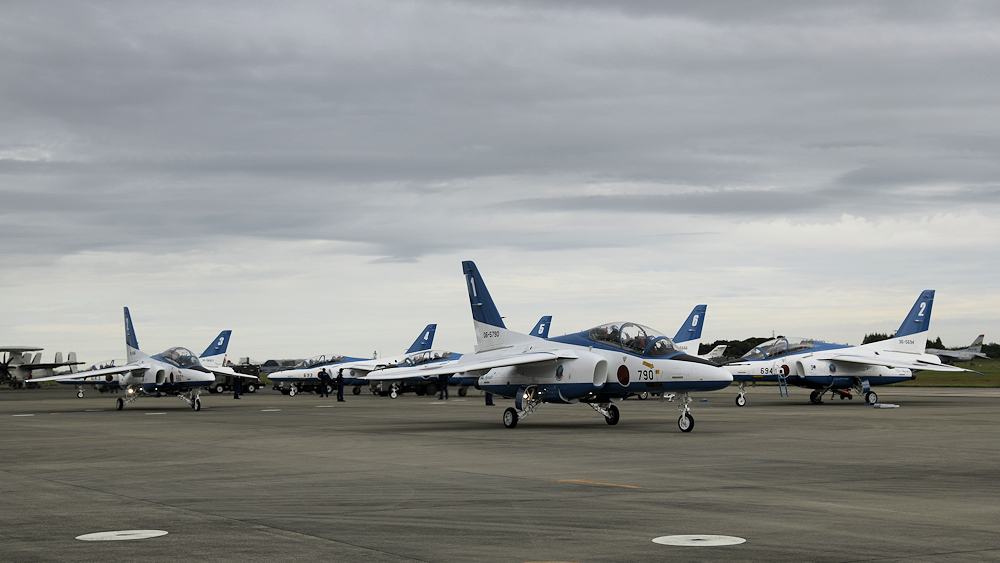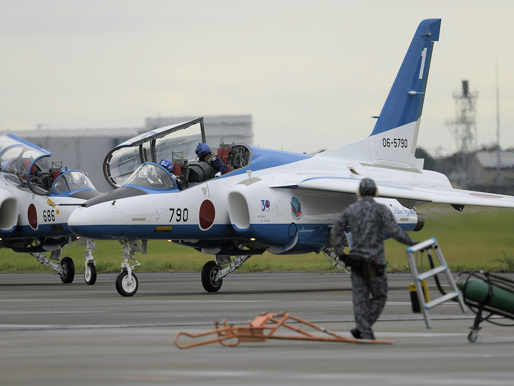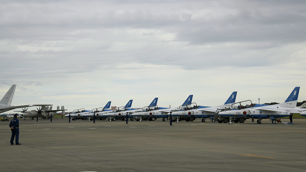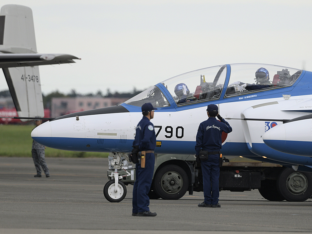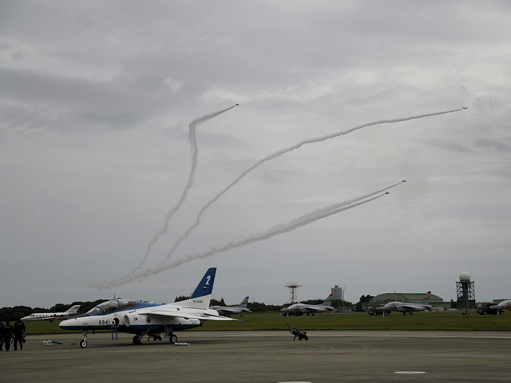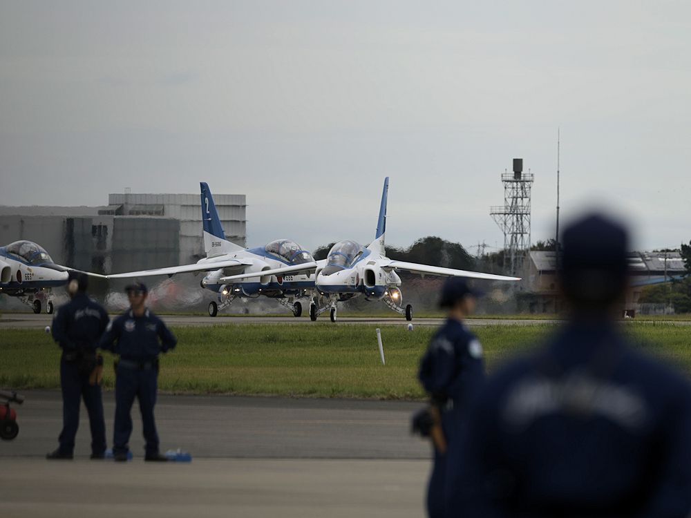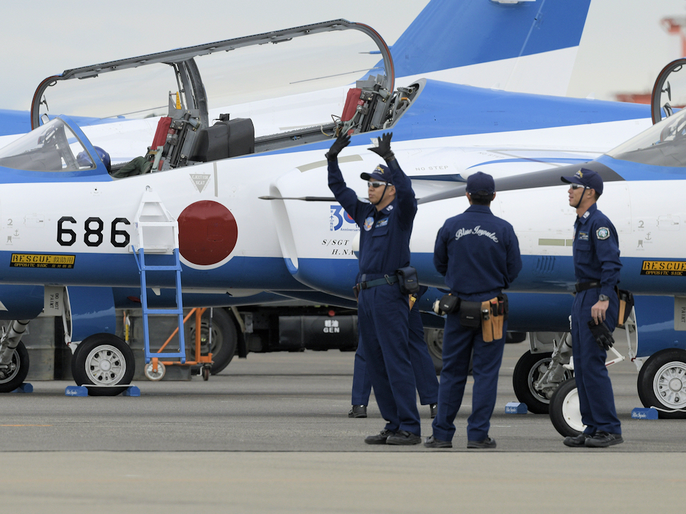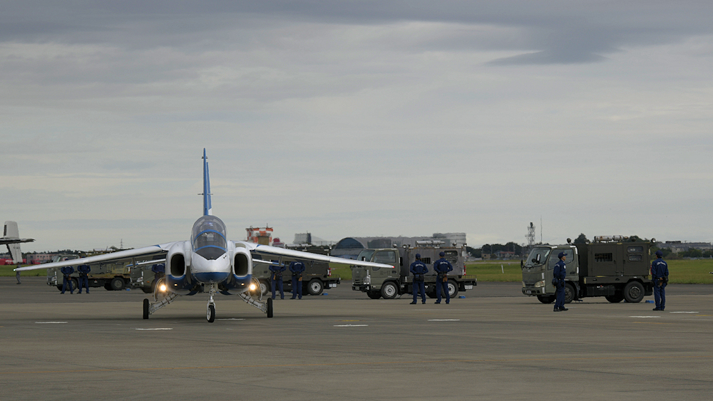 展示飛行を終えたブルーインパルスは整備員の待つ駐機位置に戻ってきます。 |