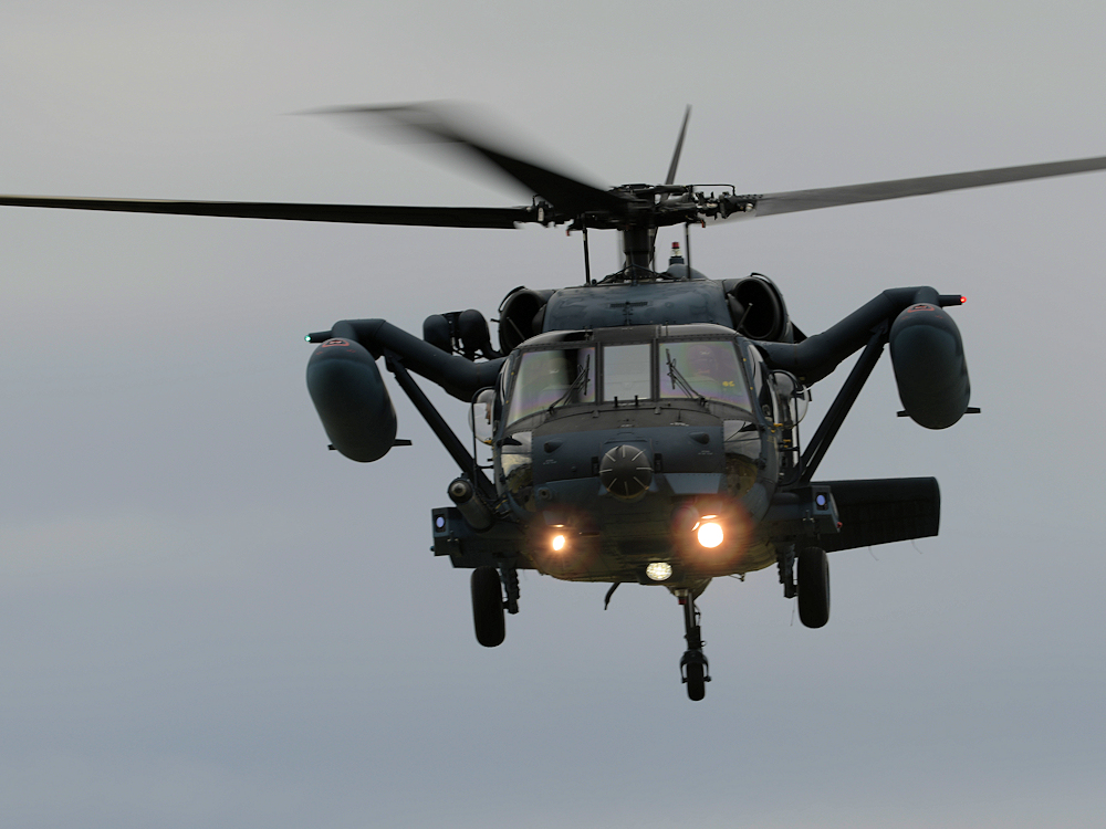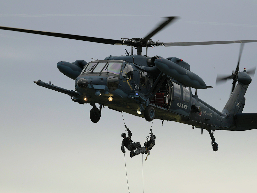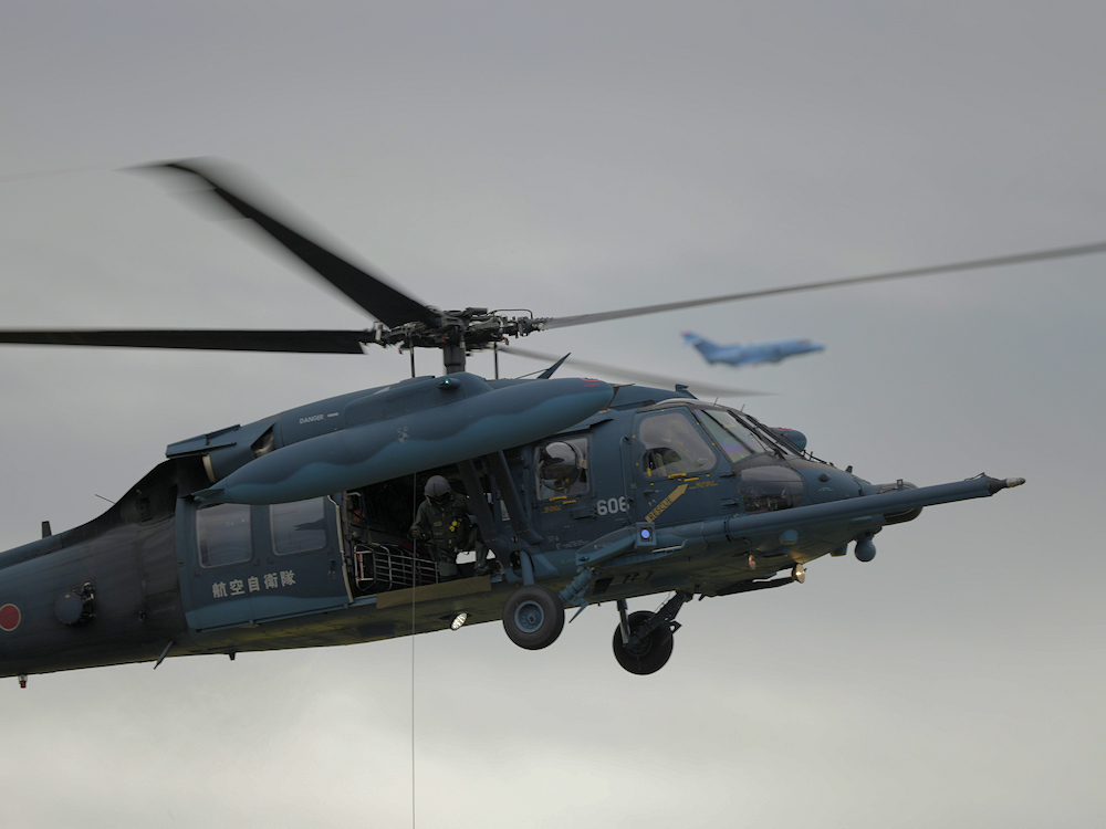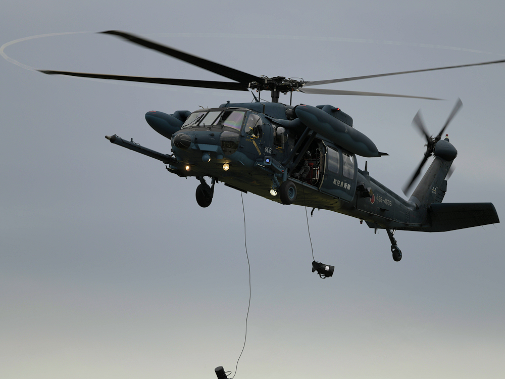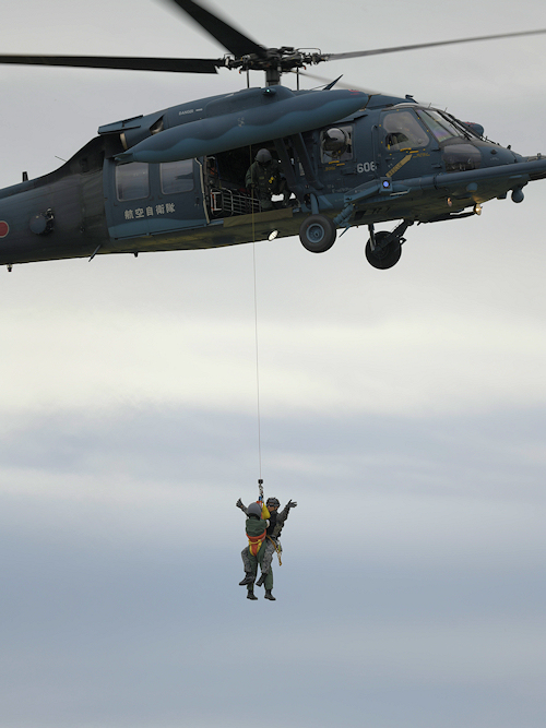 浜松救難隊はホイストによる救難訓練展示を実施。