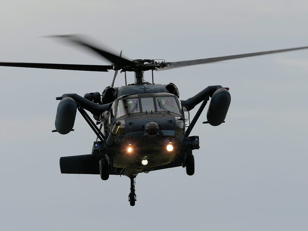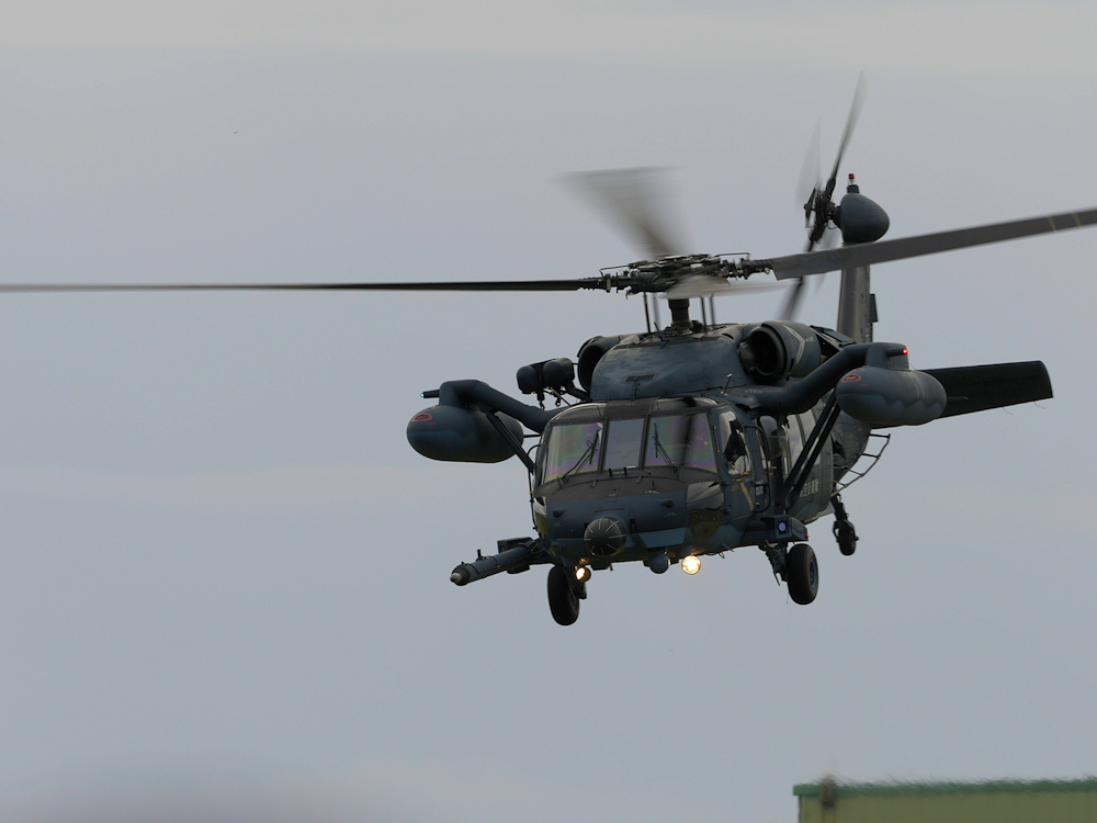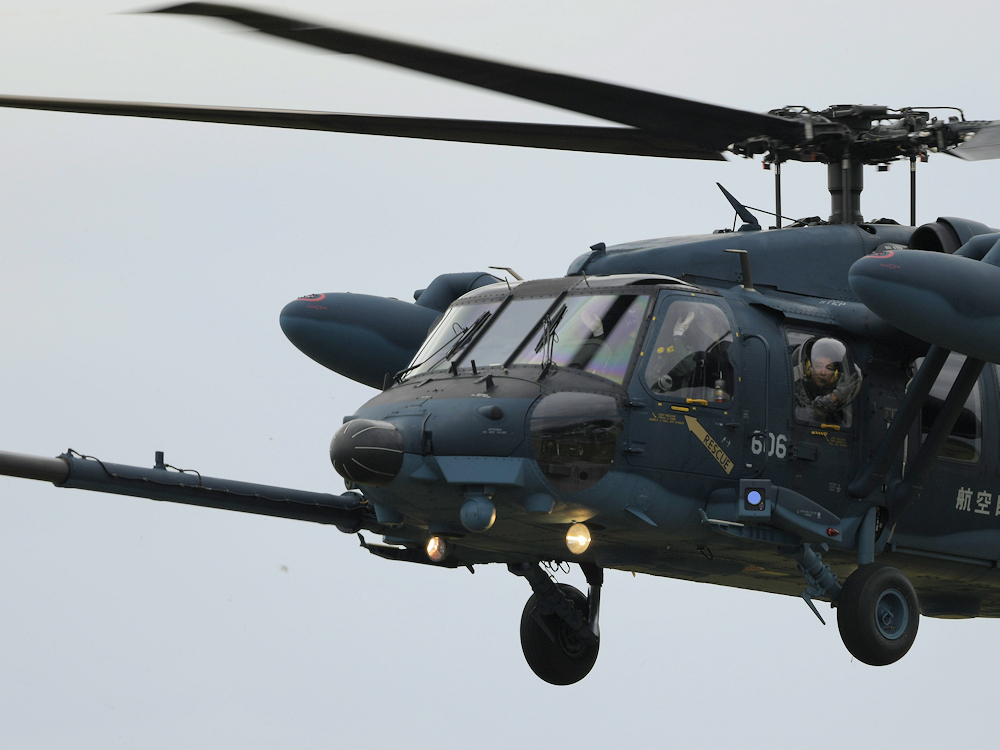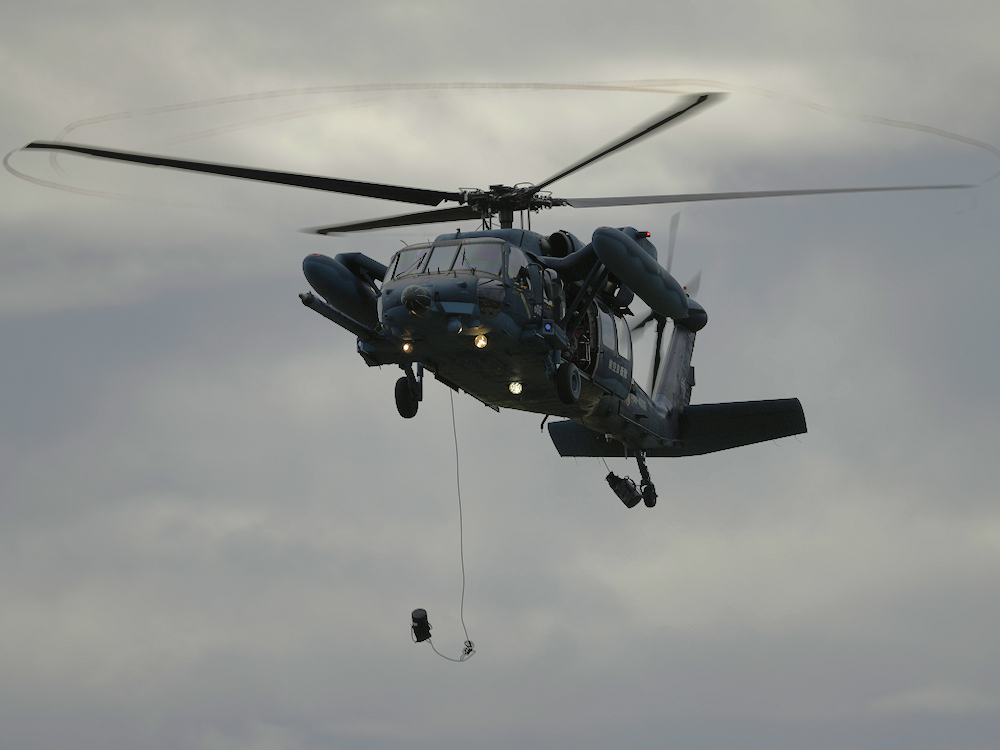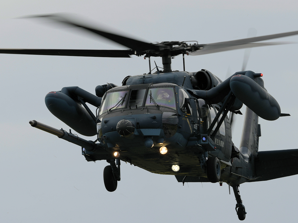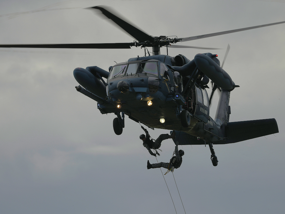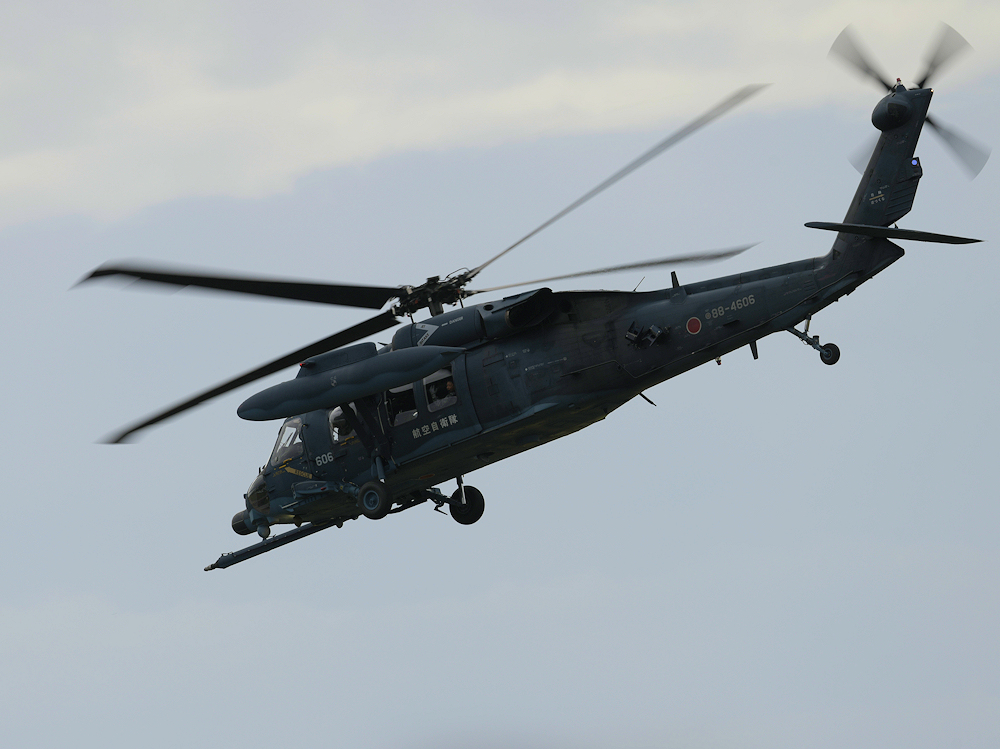 救難隊にとってこの程度の天候はなんてことないようで、ラペリング降下とホイストつり上げによる救難展示を行いました。