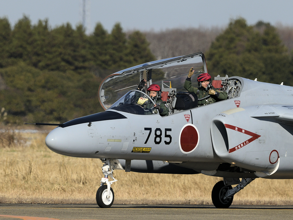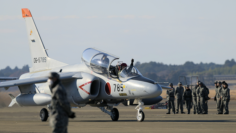 F-2はエシュロンから散開して着陸体勢に。南からの降りでしたので、T-4、F-2のパイロット氏からは駐機位置にもどる際にお手振りをいただけました。 |
