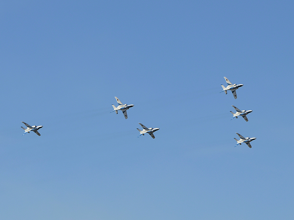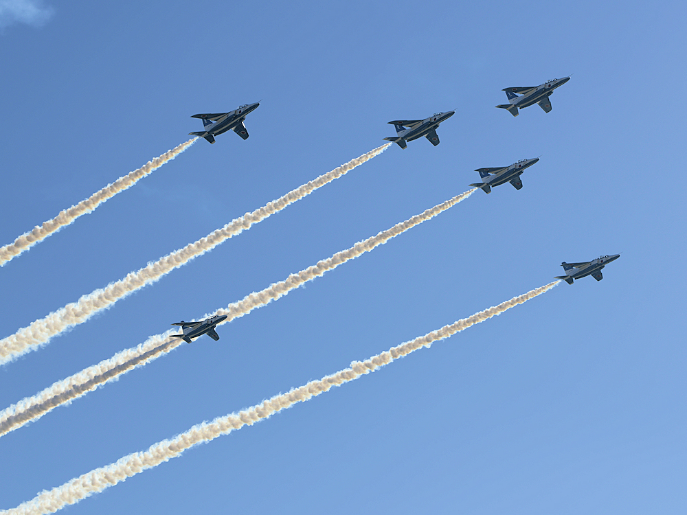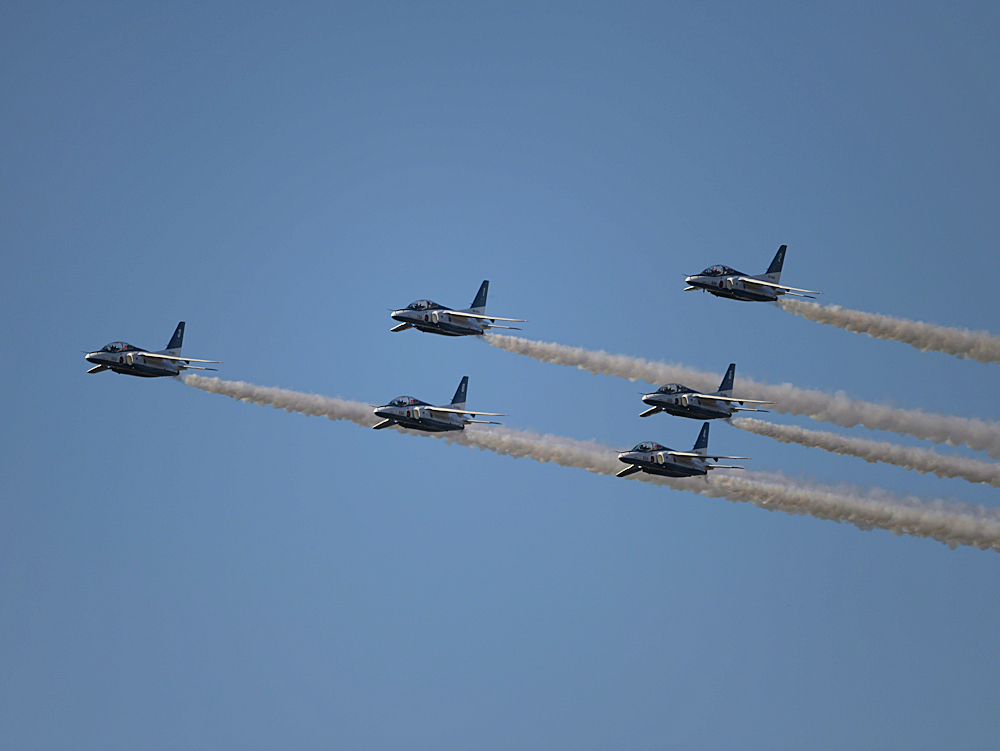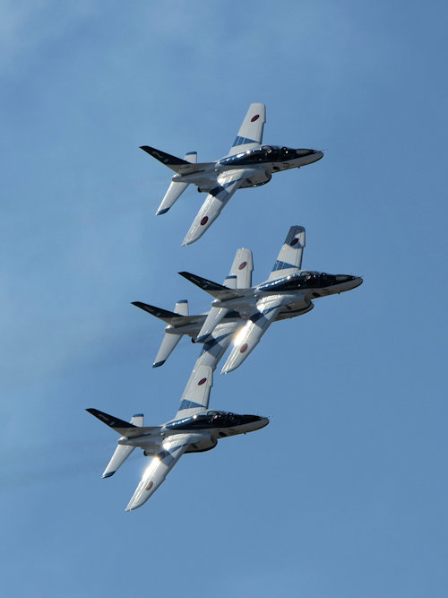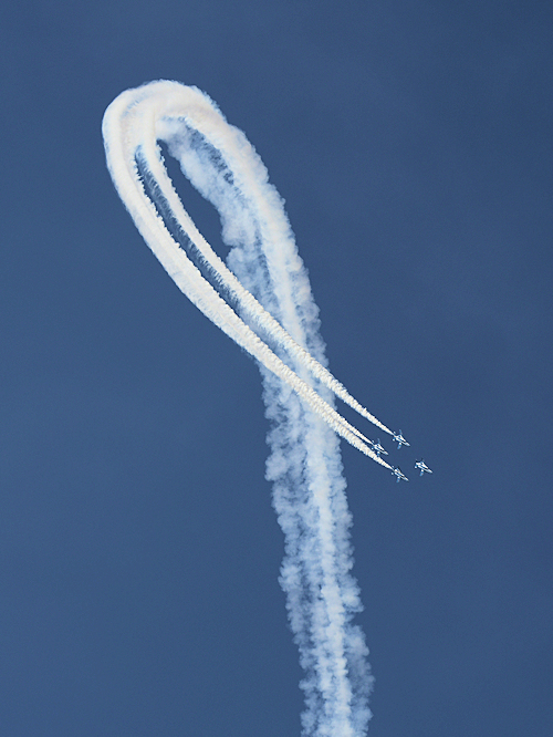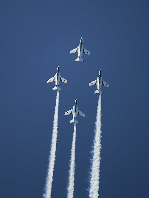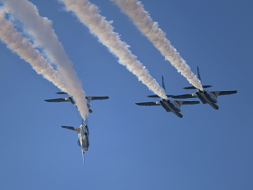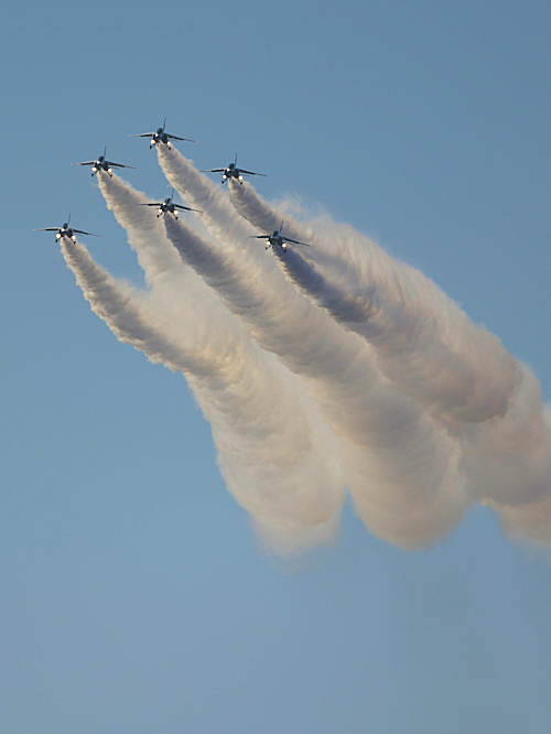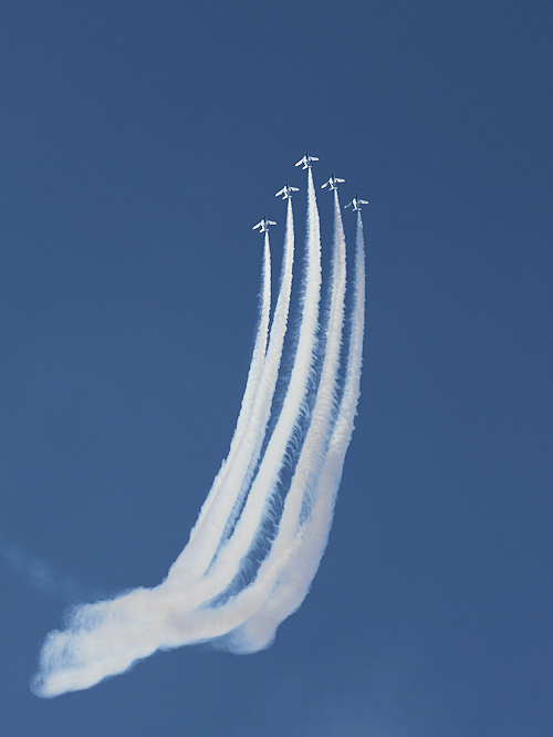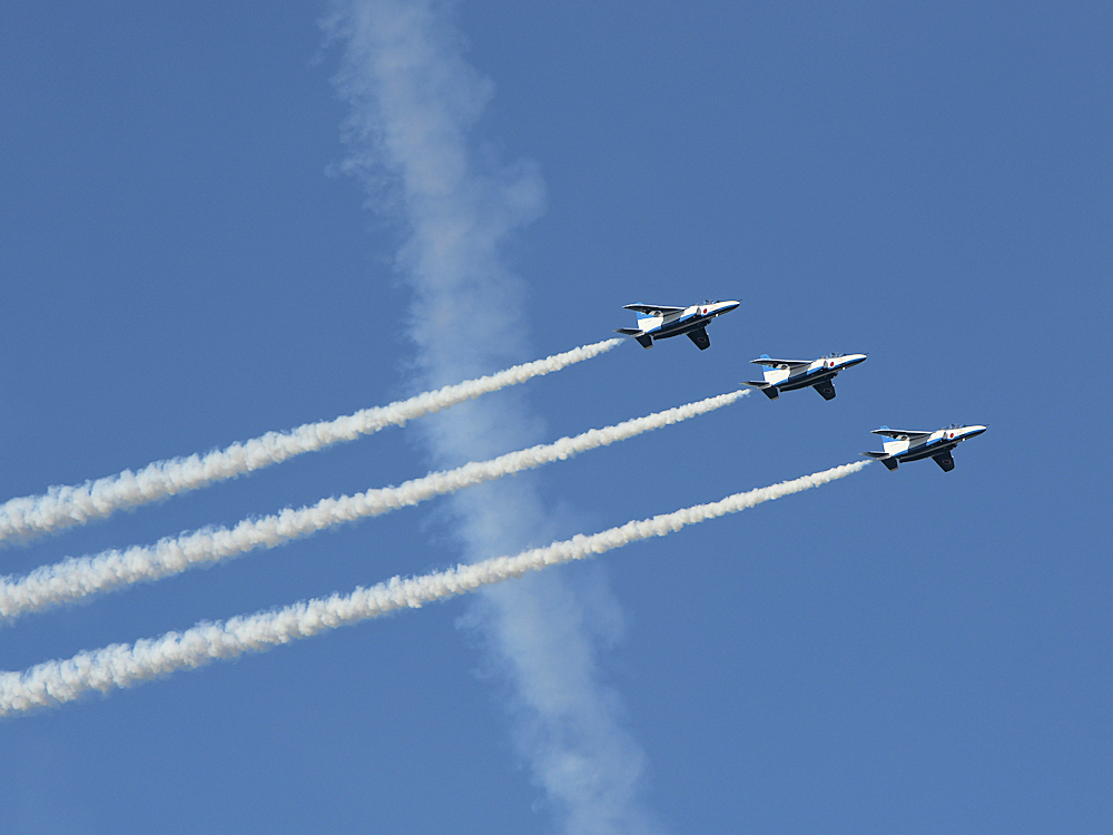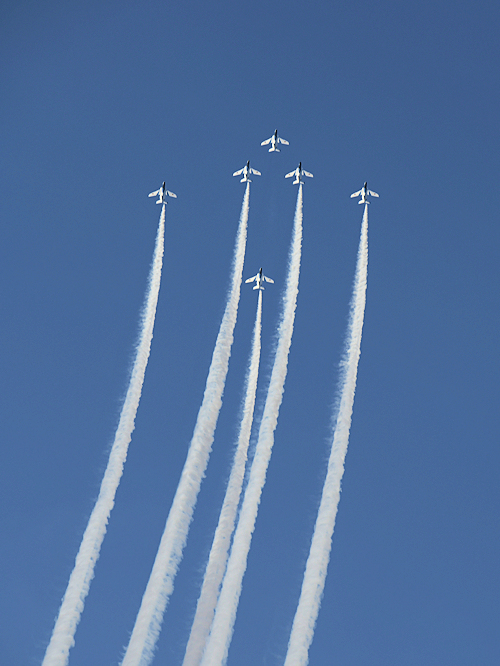 いよいよブルーインパルスの展示飛行。3シップの編隊離陸に4番機が合流。 |