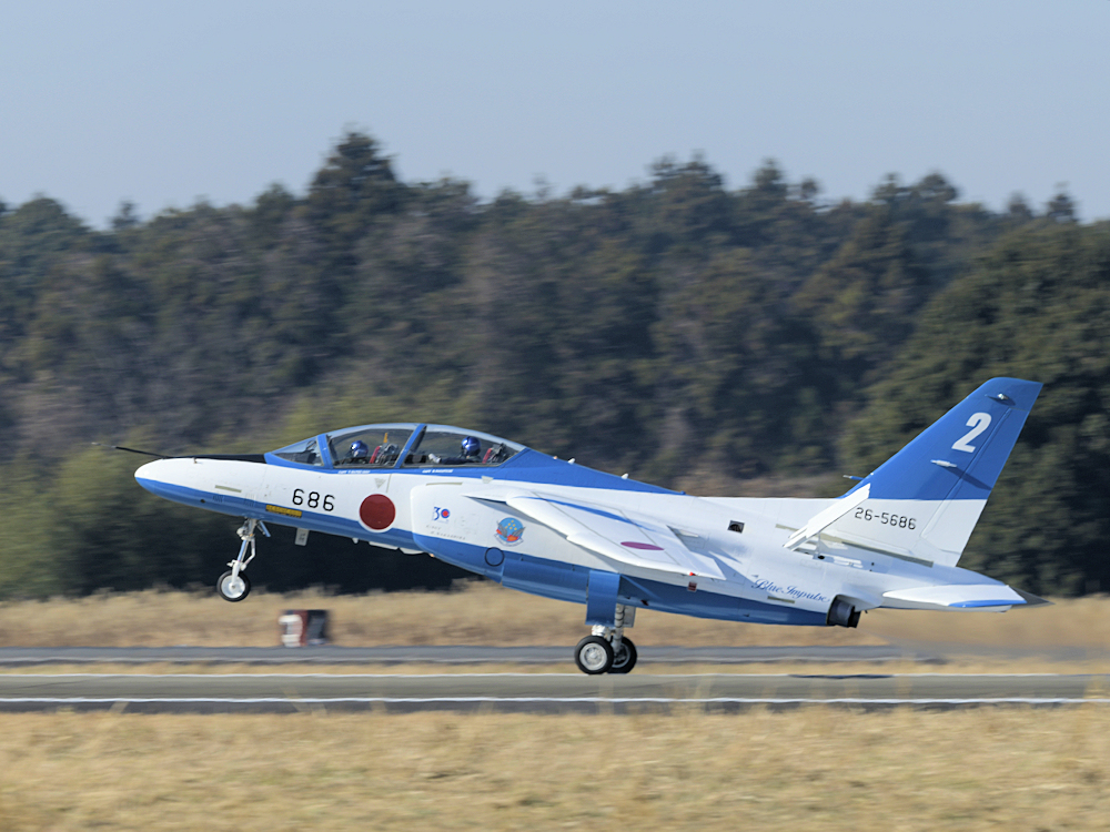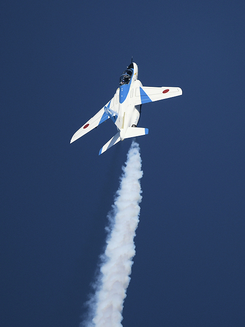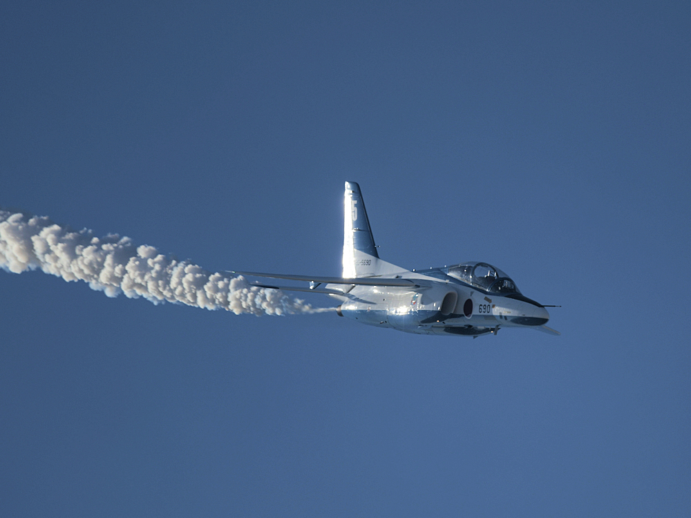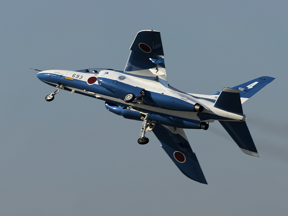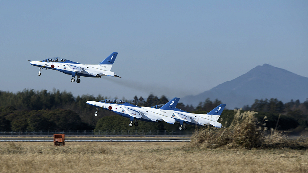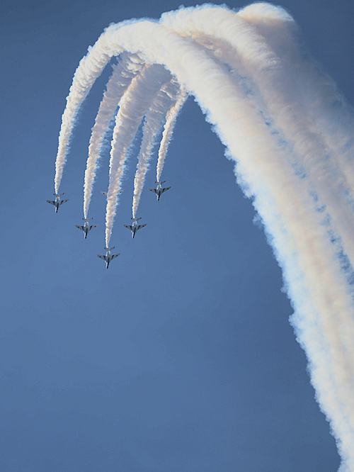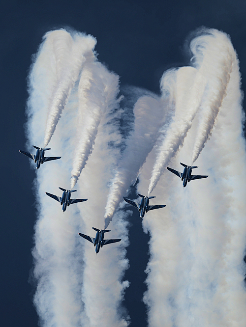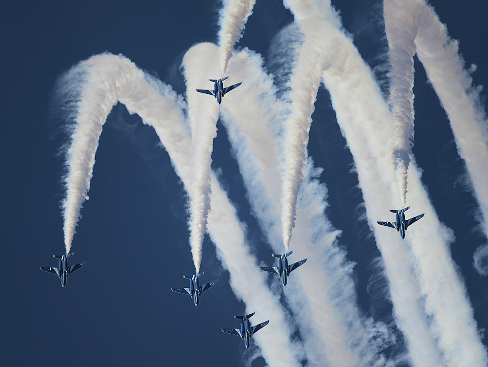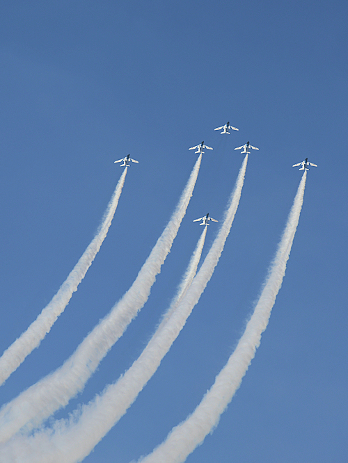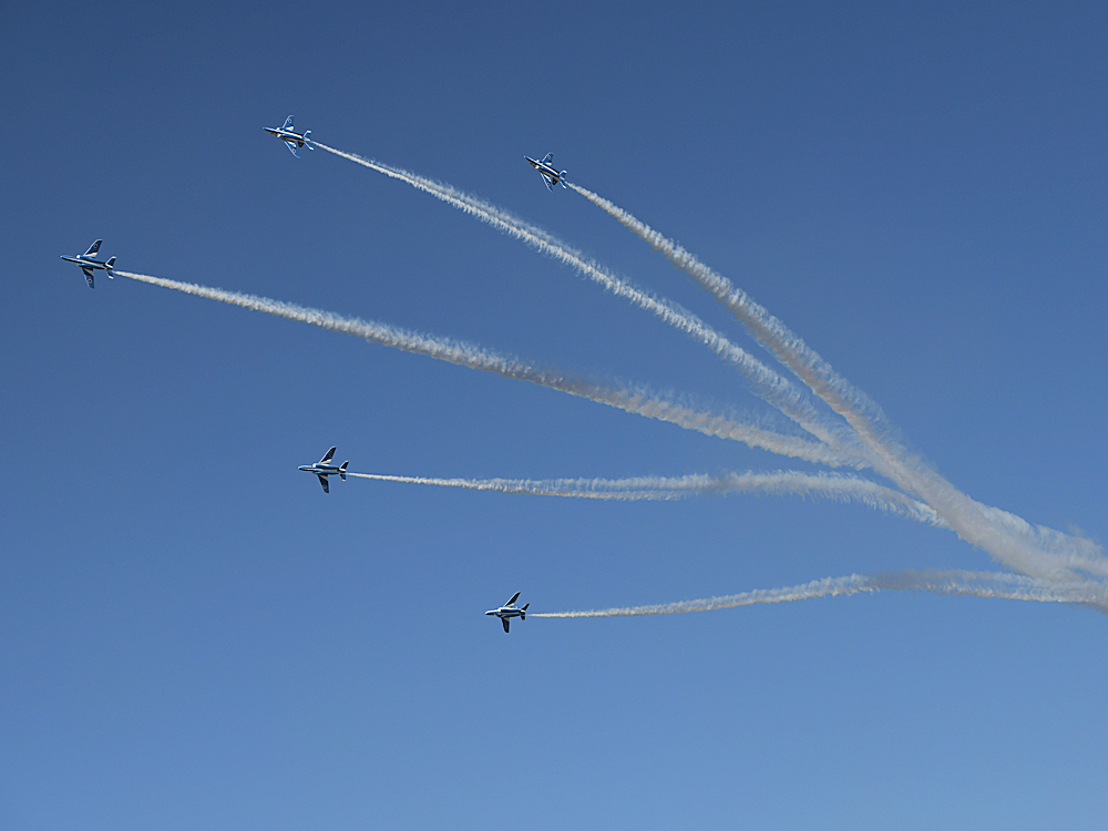 いよいよブルーインパルスの展示飛行。3シップの編隊離陸に4番機が合流。 |