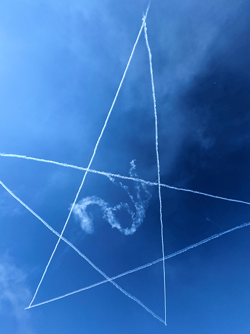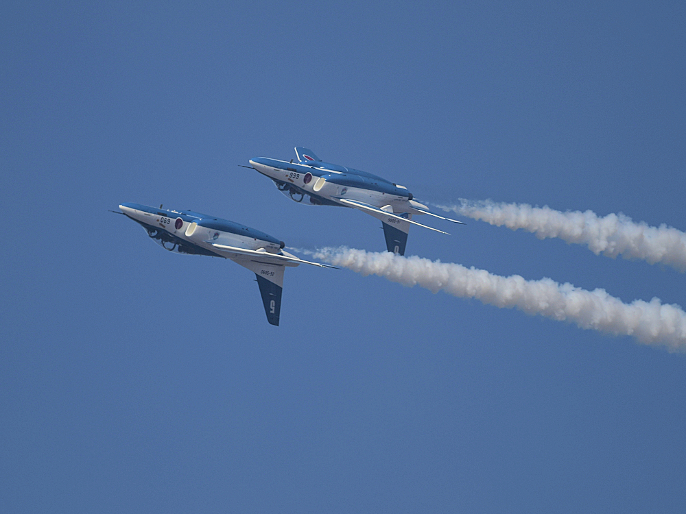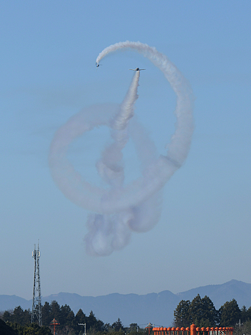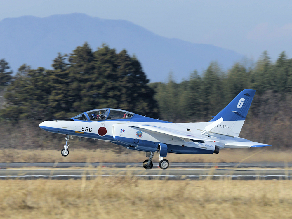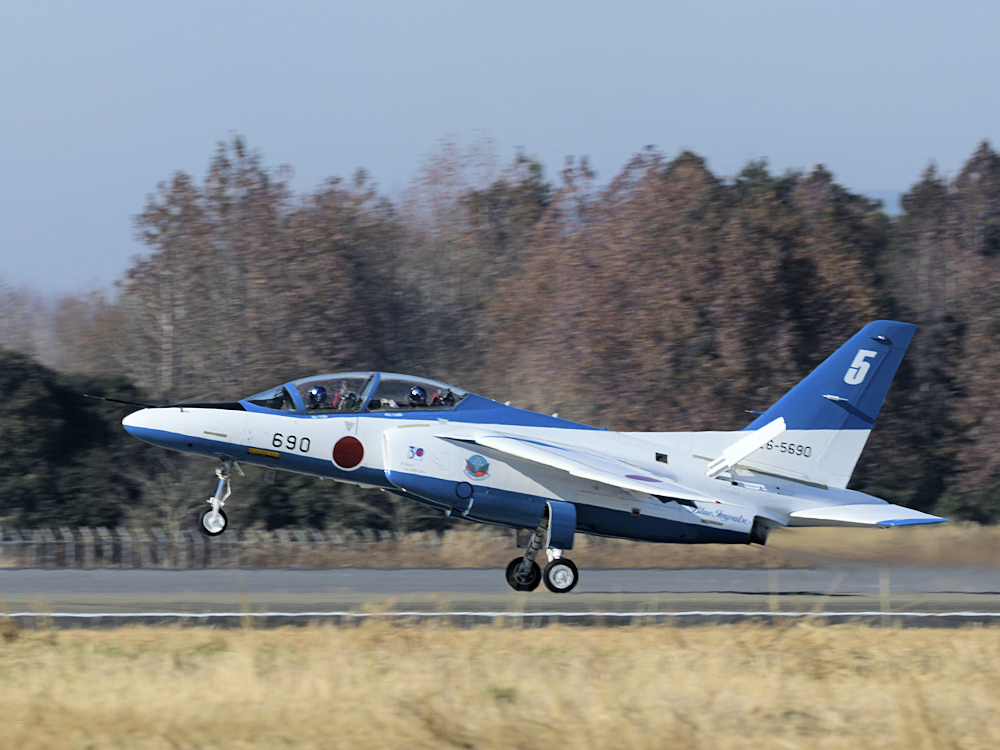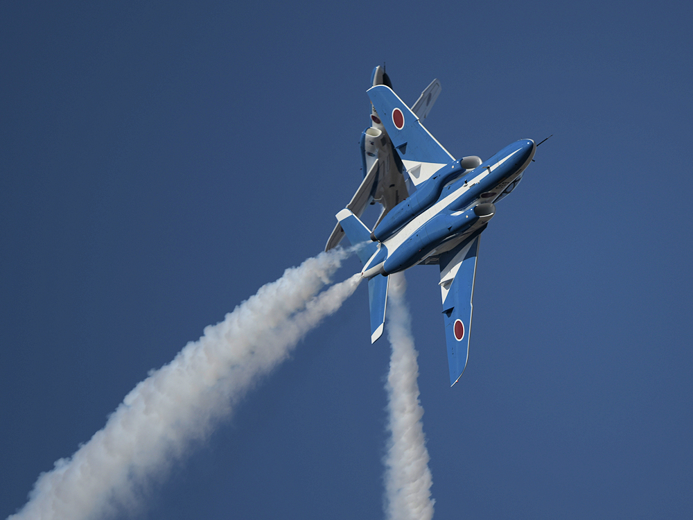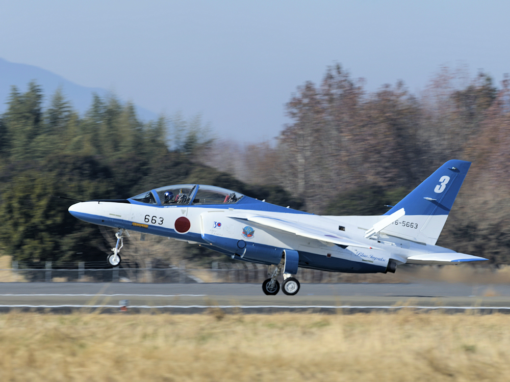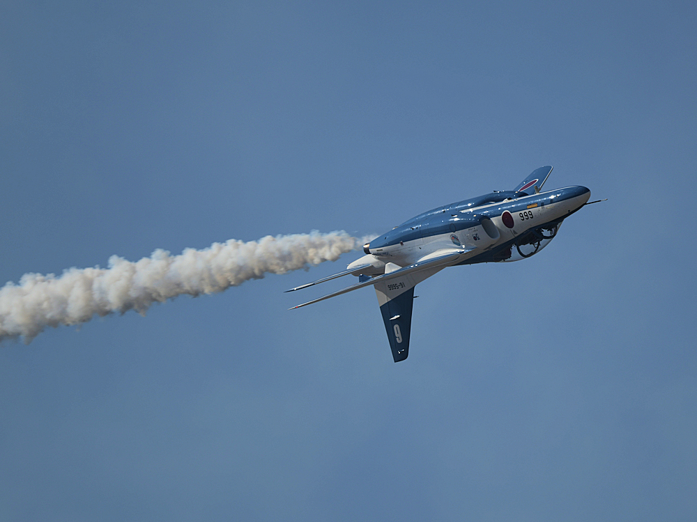 いよいよブルーインパルスの展示飛行。3シップの編隊離陸に4番機が合流。 |