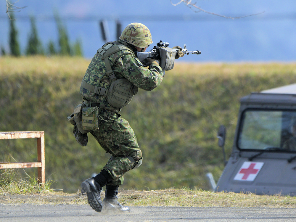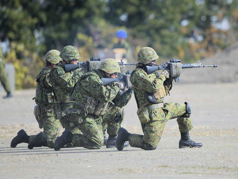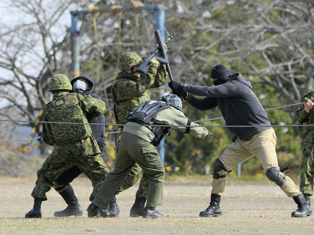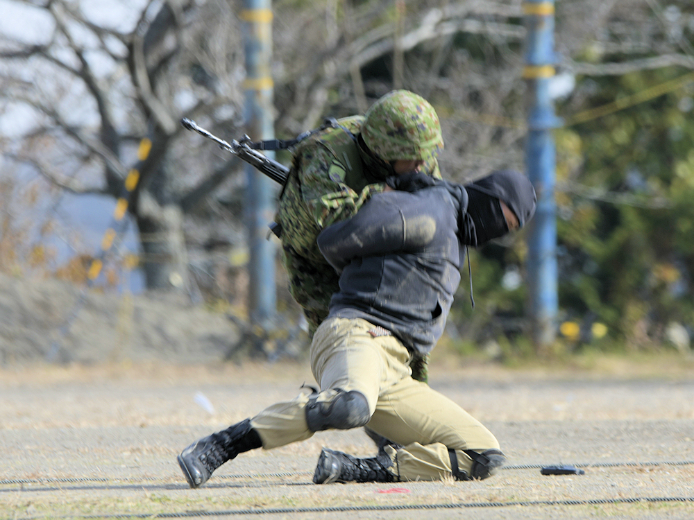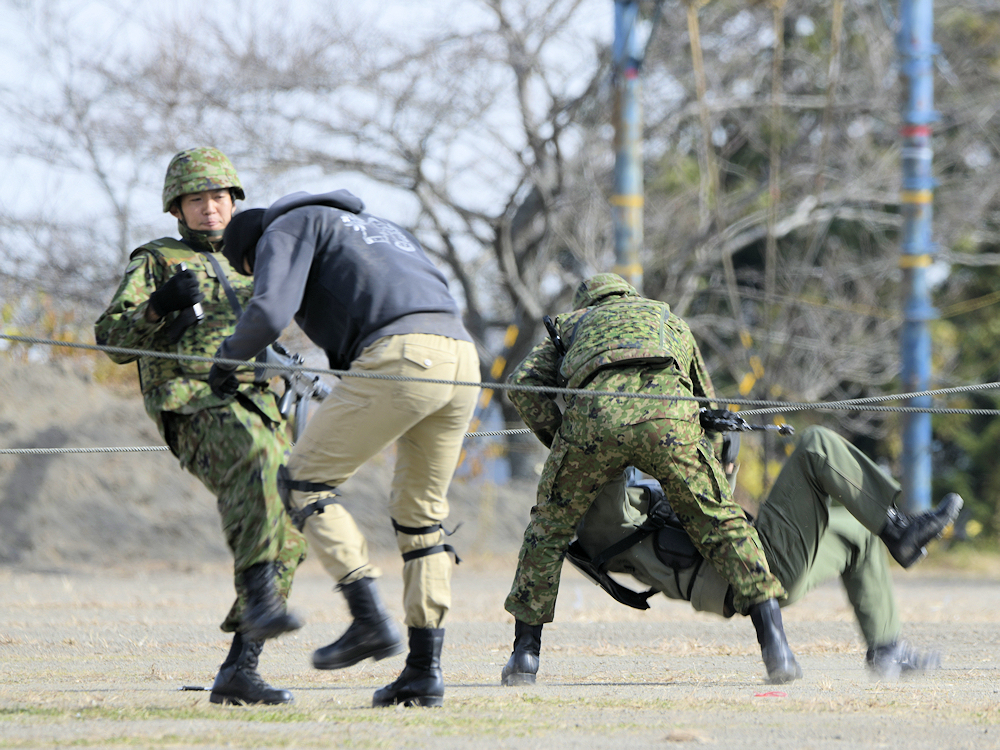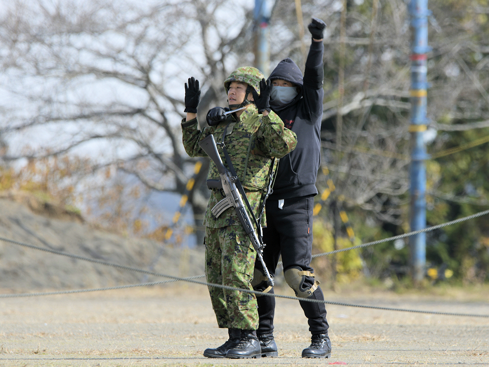 ほぼ快晴の板妻駐屯地創立記念行事。近接戦闘展示では様々な姿勢による射撃と、不審者と自衛隊員の格闘展示を披露。後者はほぼヒーローショーのノリで展開。