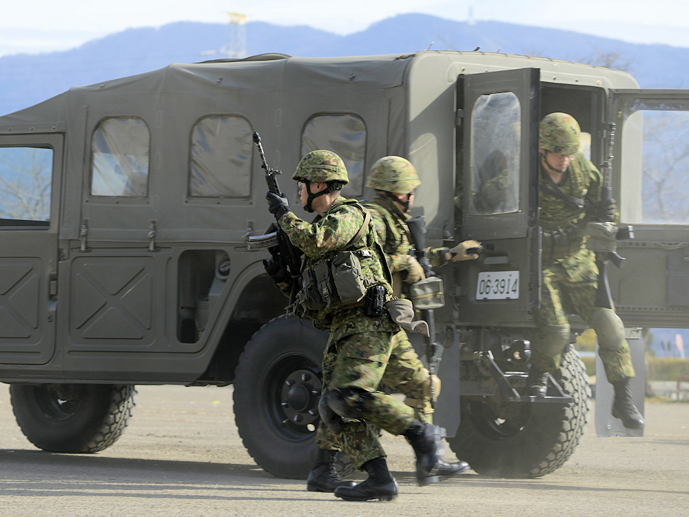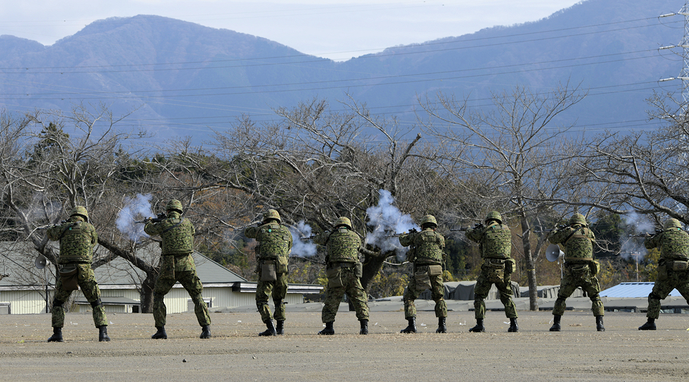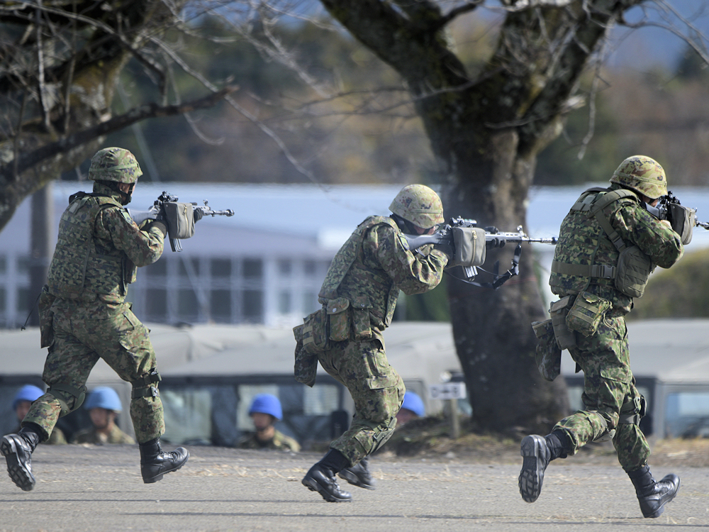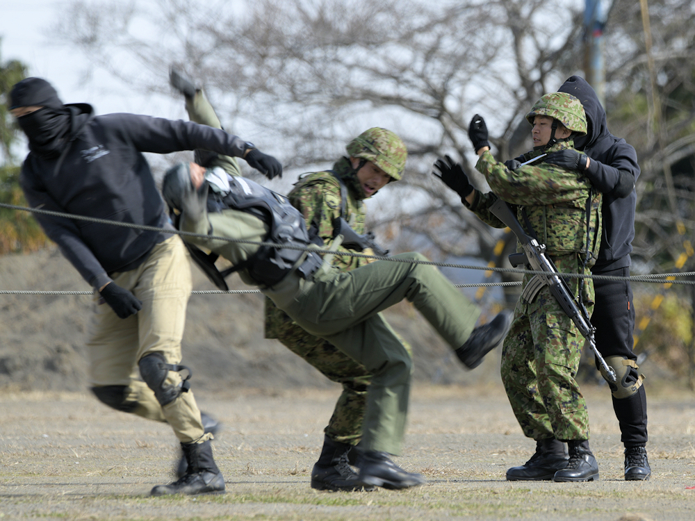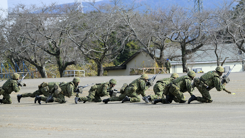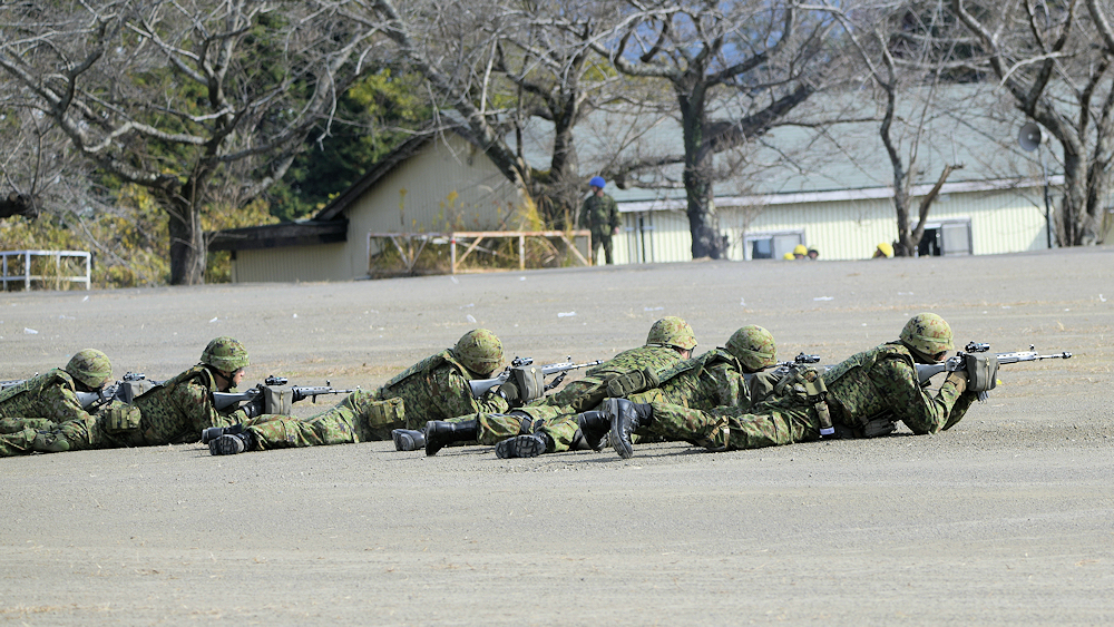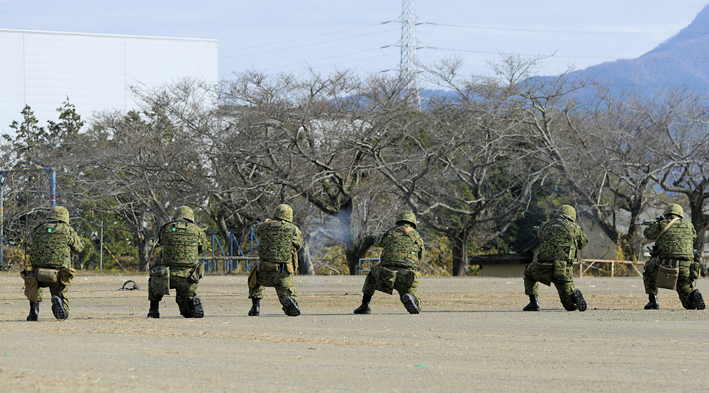 ほぼ快晴の板妻駐屯地創立記念行事。近接戦闘展示では様々な姿勢による射撃と、不審者と自衛隊員の格闘展示を披露。後者はほぼヒーローショーのノリで展開。