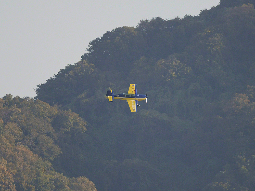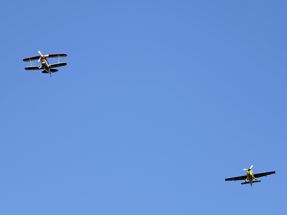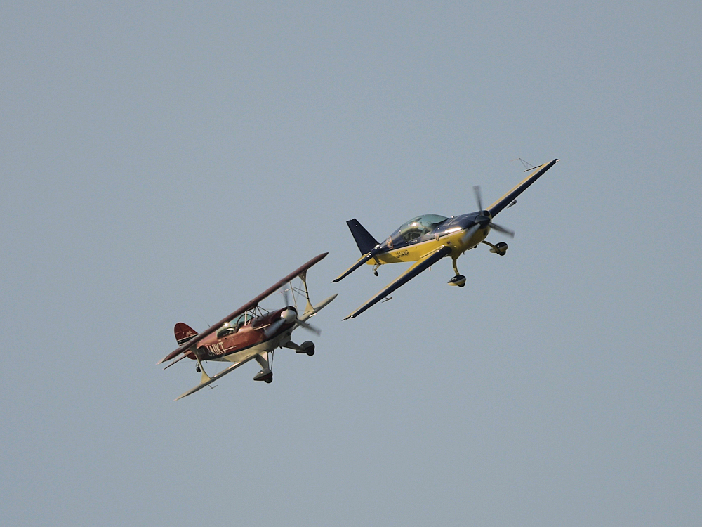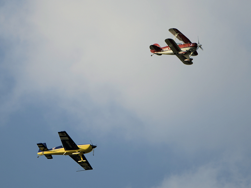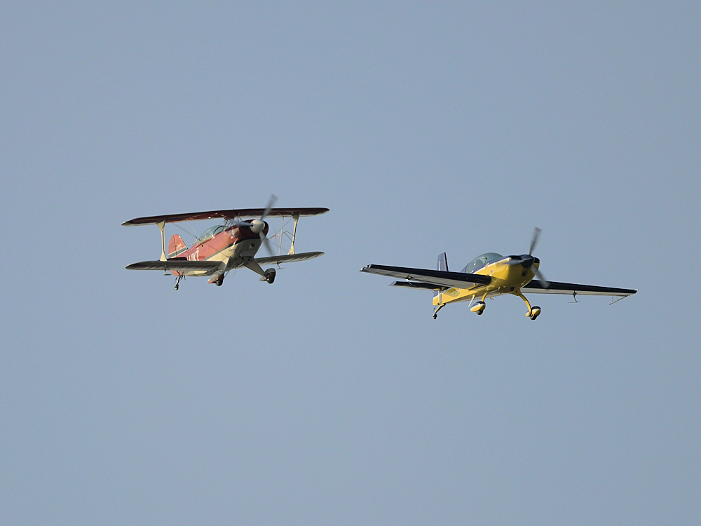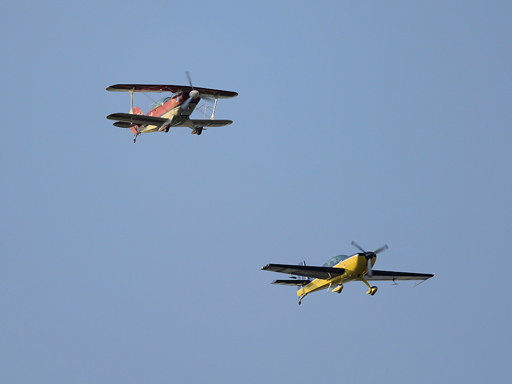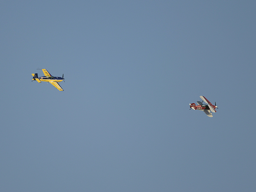 ピッツに続き、エクストラが離陸。2機は編隊を組んで、飛行場上空へ。