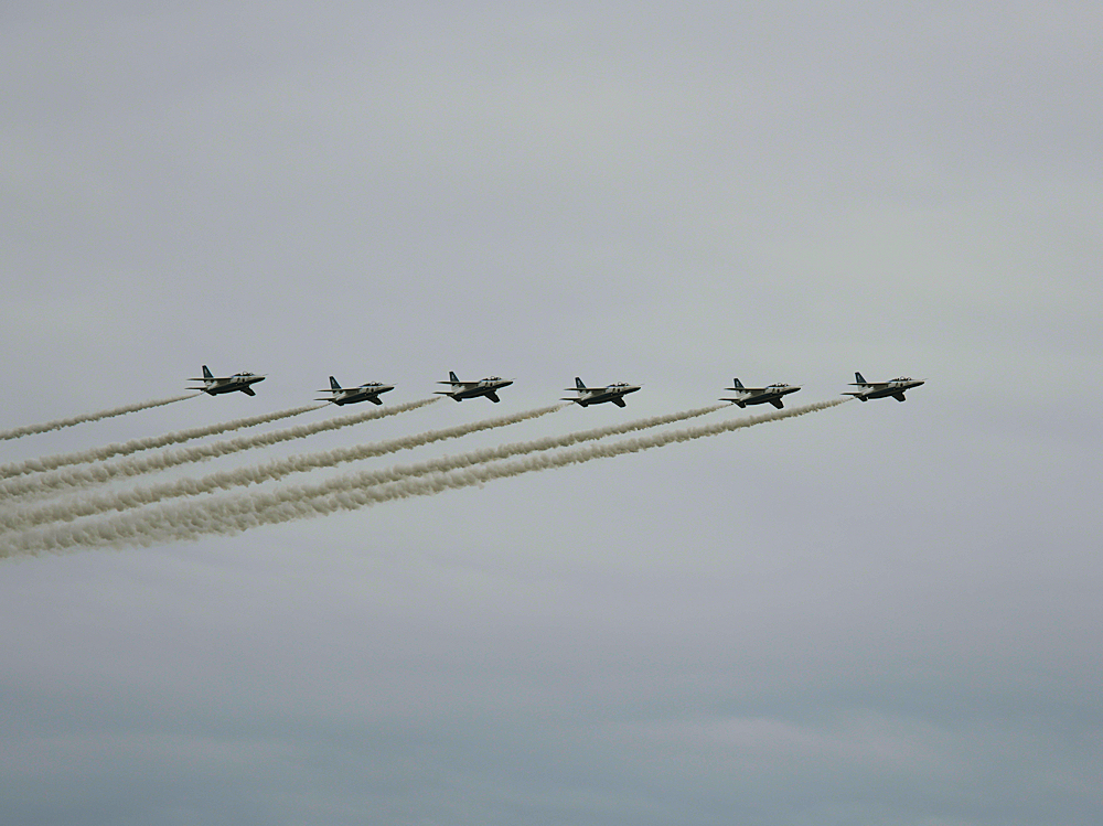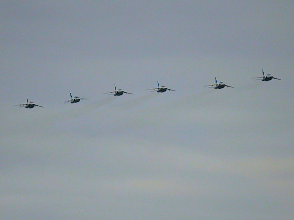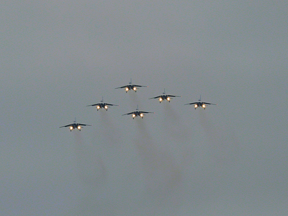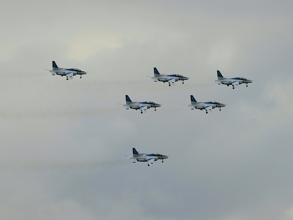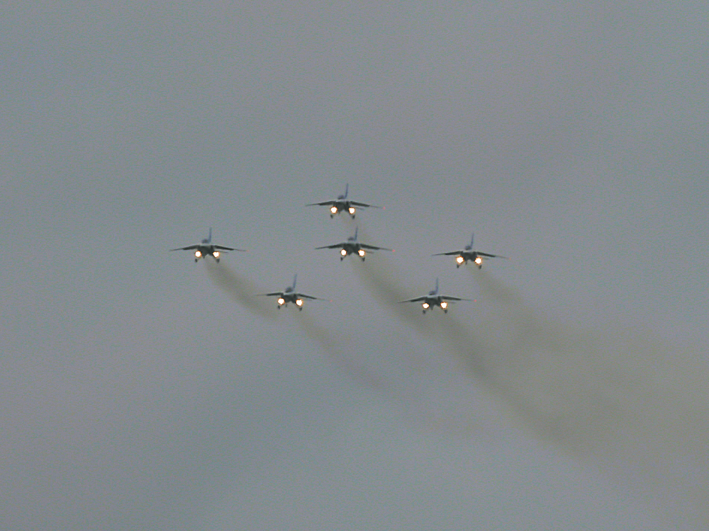 といっても、一味違います。最初の6航過はすべて着陸形体。全機、着陸灯を点灯したのち、一航過目は1番機、二航過目は2番機のみ着陸灯点灯・・・.、と言う具合に、編隊中の機番位置がわかる演出がされていました。