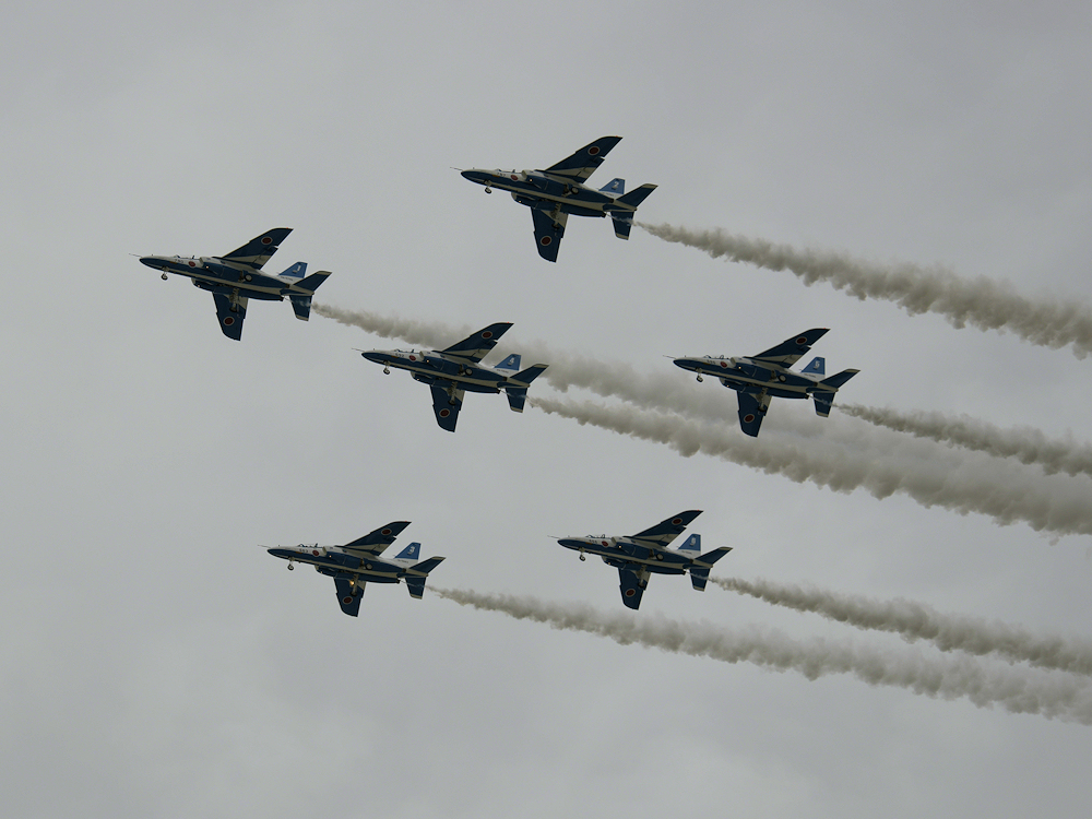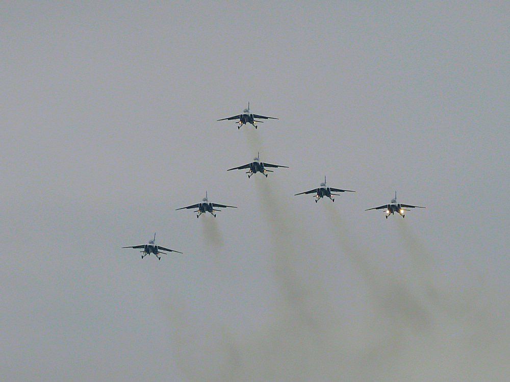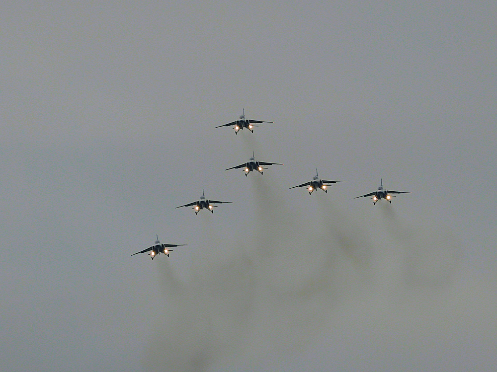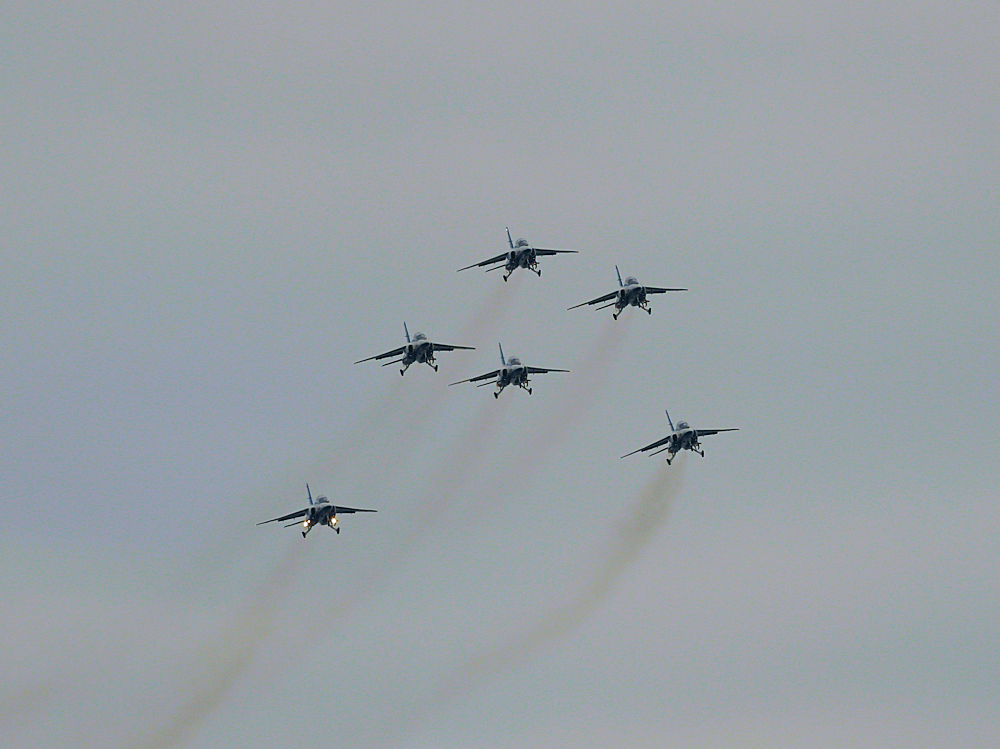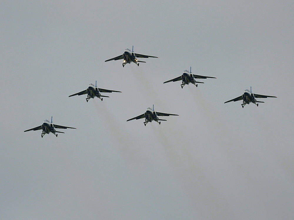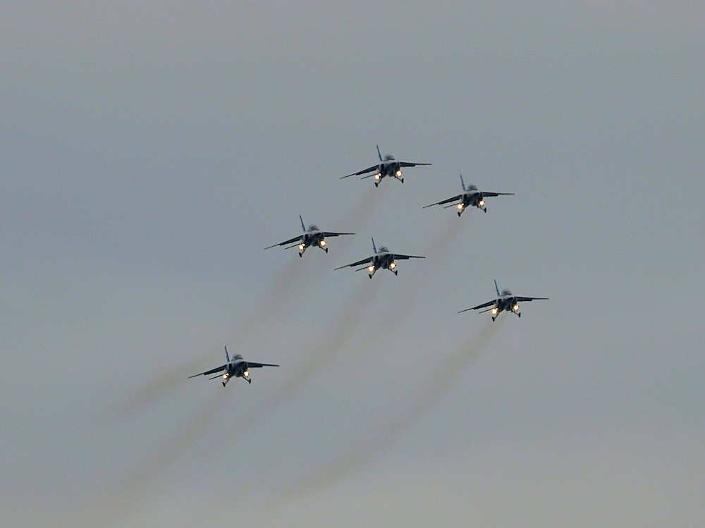 といっても、一味違います。最初の6航過はすべて着陸形体。全機、着陸灯を点灯したのち、一航過目は1番機、二航過目は2番機のみ着陸灯点灯・・・.、と言う具合に、編隊中の機番位置がわかる演出がされていました。