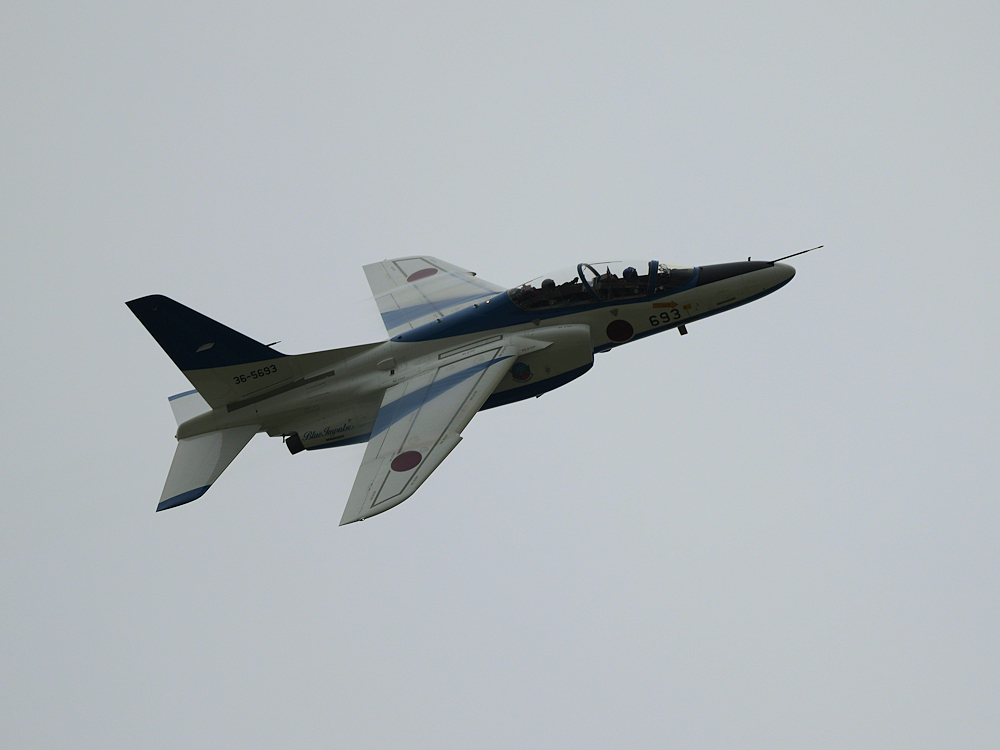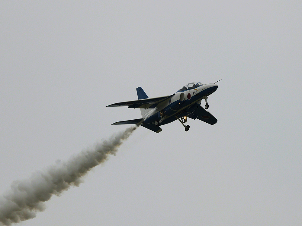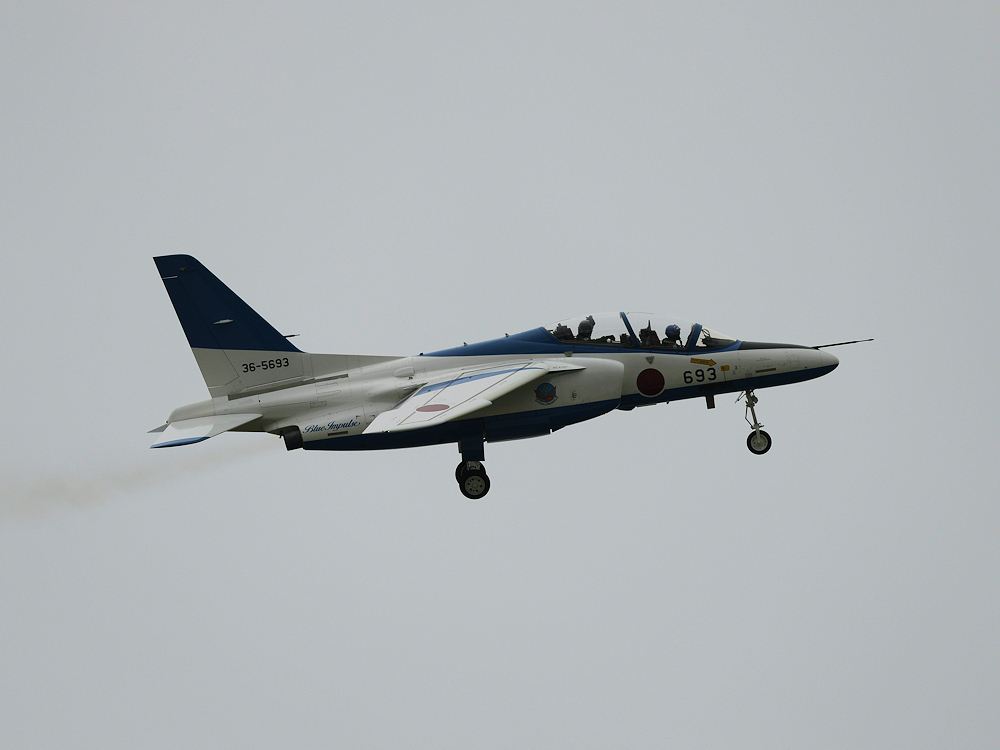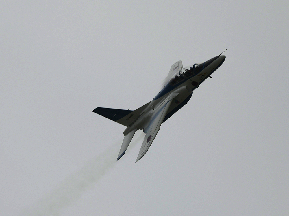 厚い雲が広がる松島基地航空祭。オープニングはF-2Bを除く基地所属機による航過飛行(F-2Bは8月に発生した百里基地所属機墜落事故の影響で飛行停止中)。ブルーインパルス7番機はここぞとばかりに翼面にベイパーを発生させて大活躍。