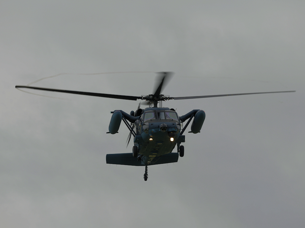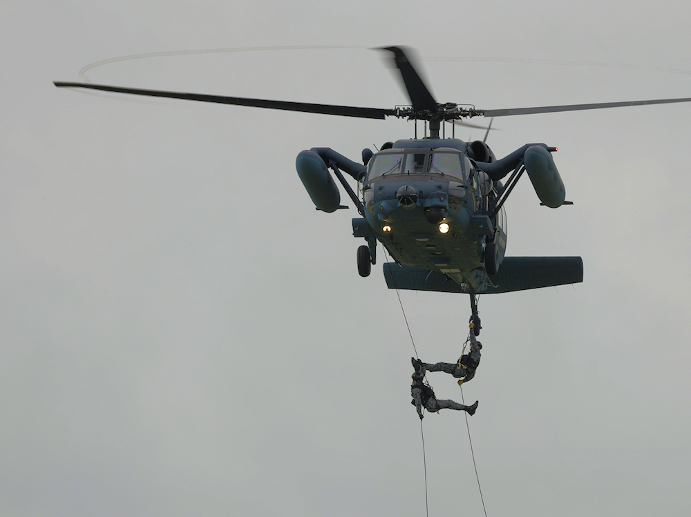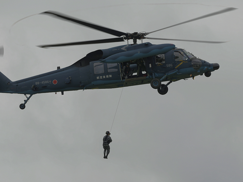 そして、UH-60Jから救難員がラペリング降下。要救助者をホイストで吊り上げたのち、救難員を回収します。