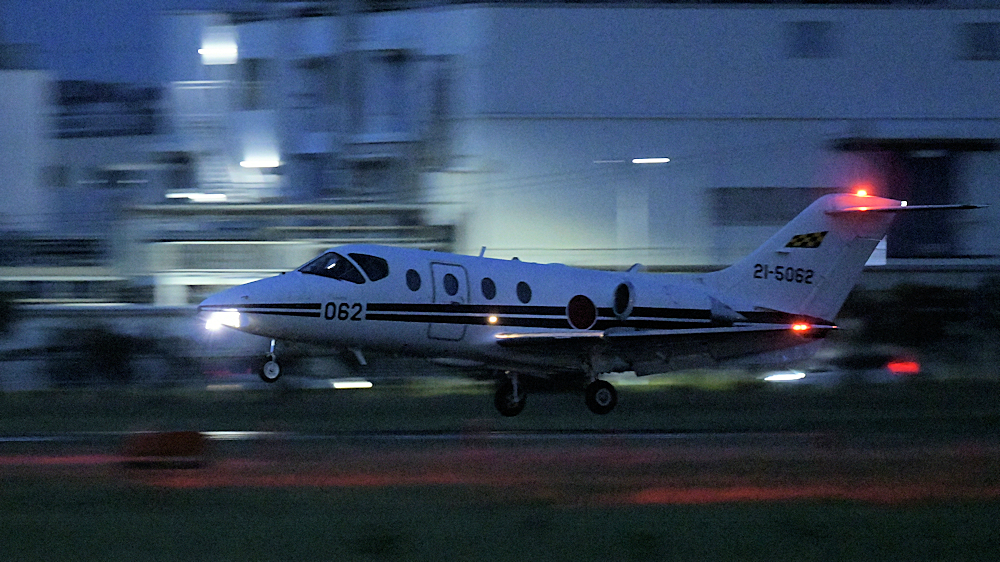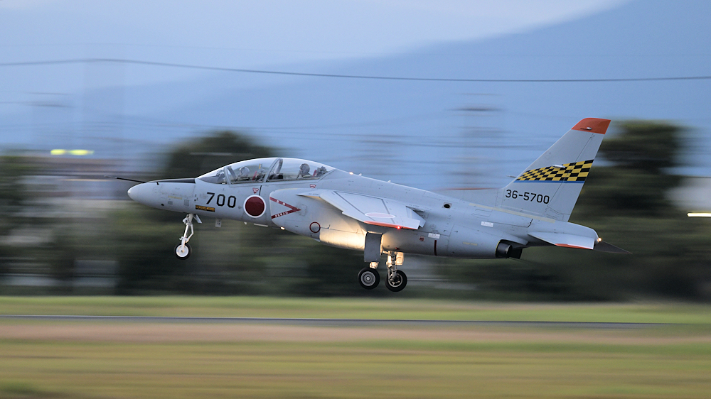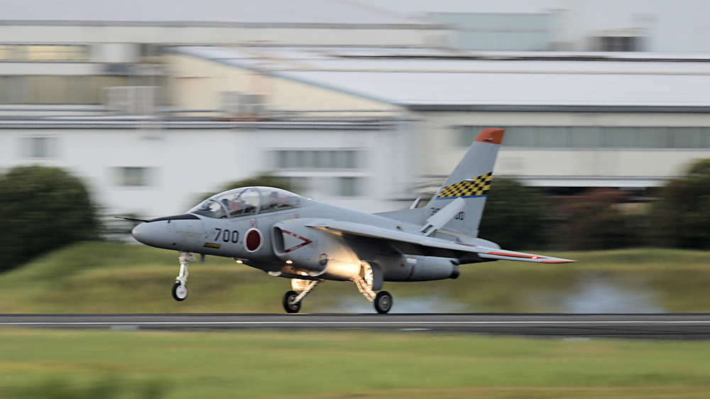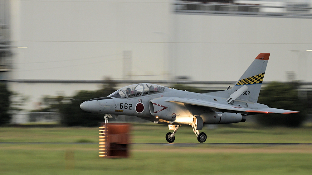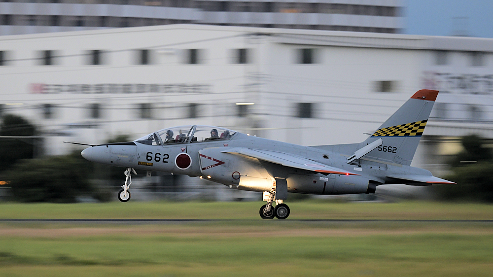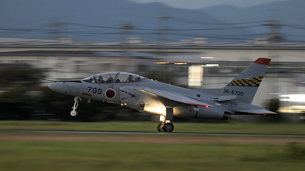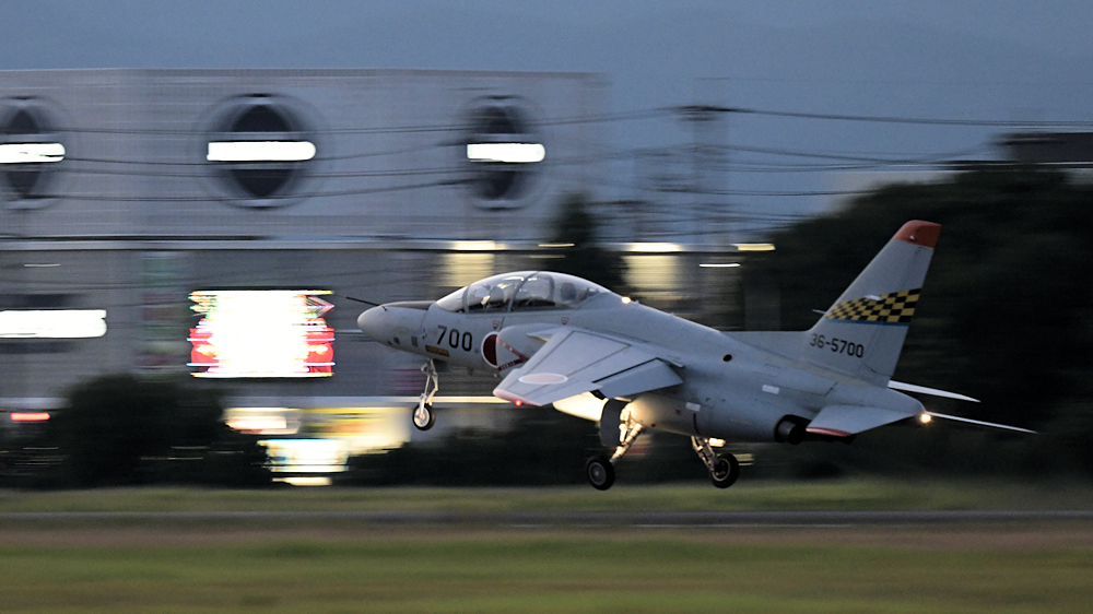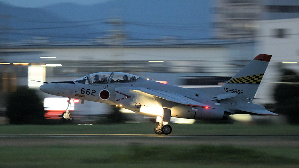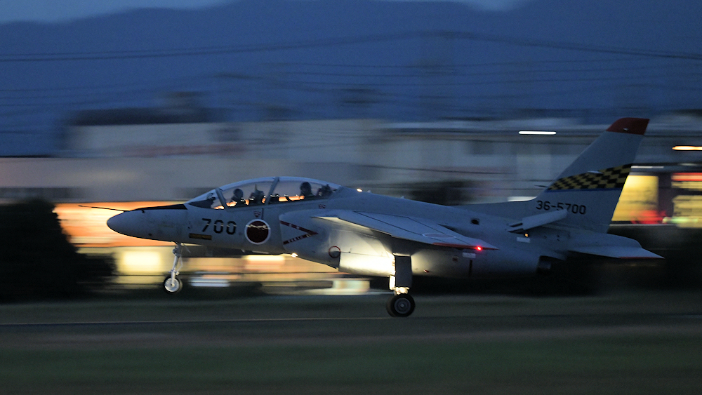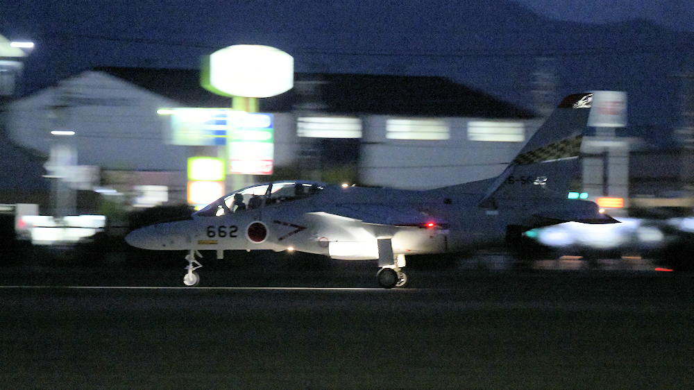 西の空が夕焼けに染まる頃、夜間訓練飛行に飛び立つT-4が移動開始。