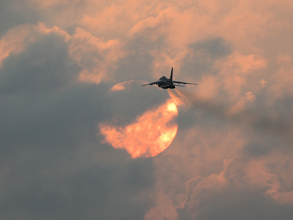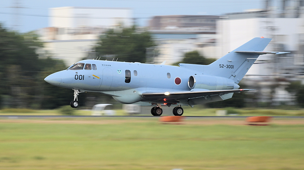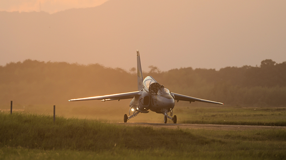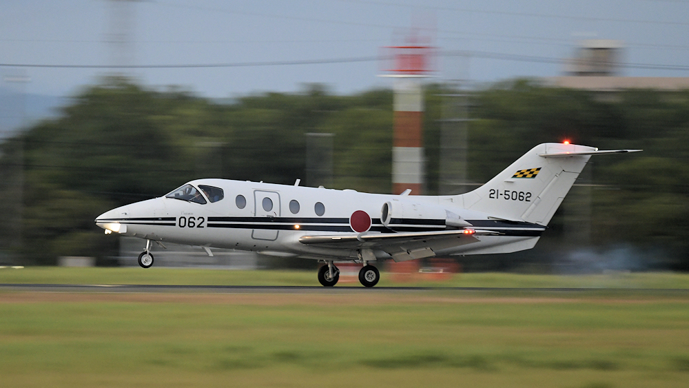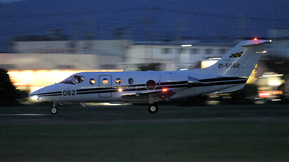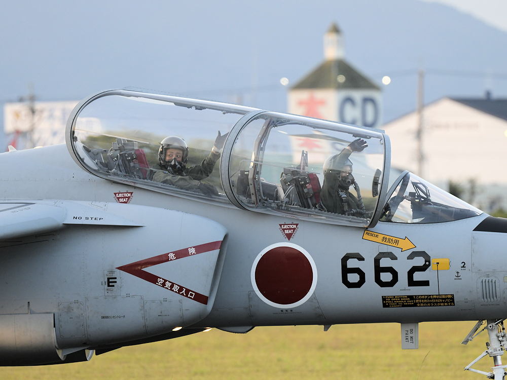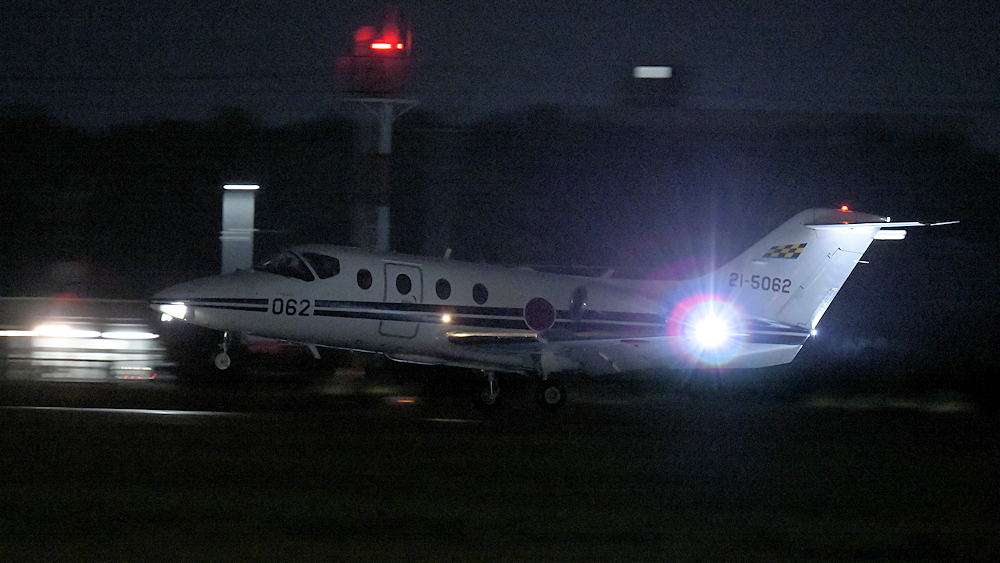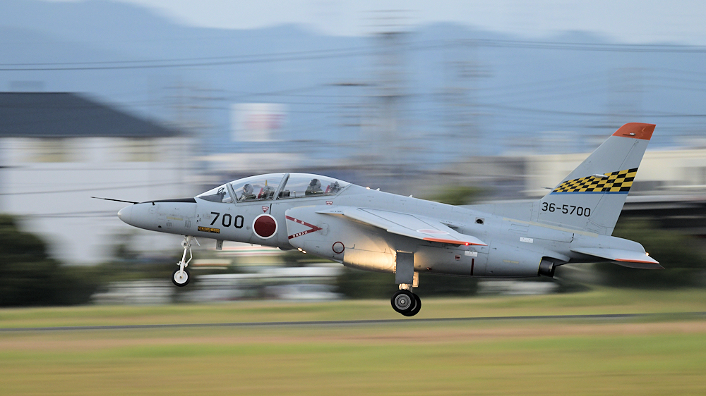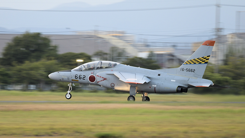 西の空が夕焼けに染まる頃、夜間訓練飛行に飛び立つT-4が移動開始。