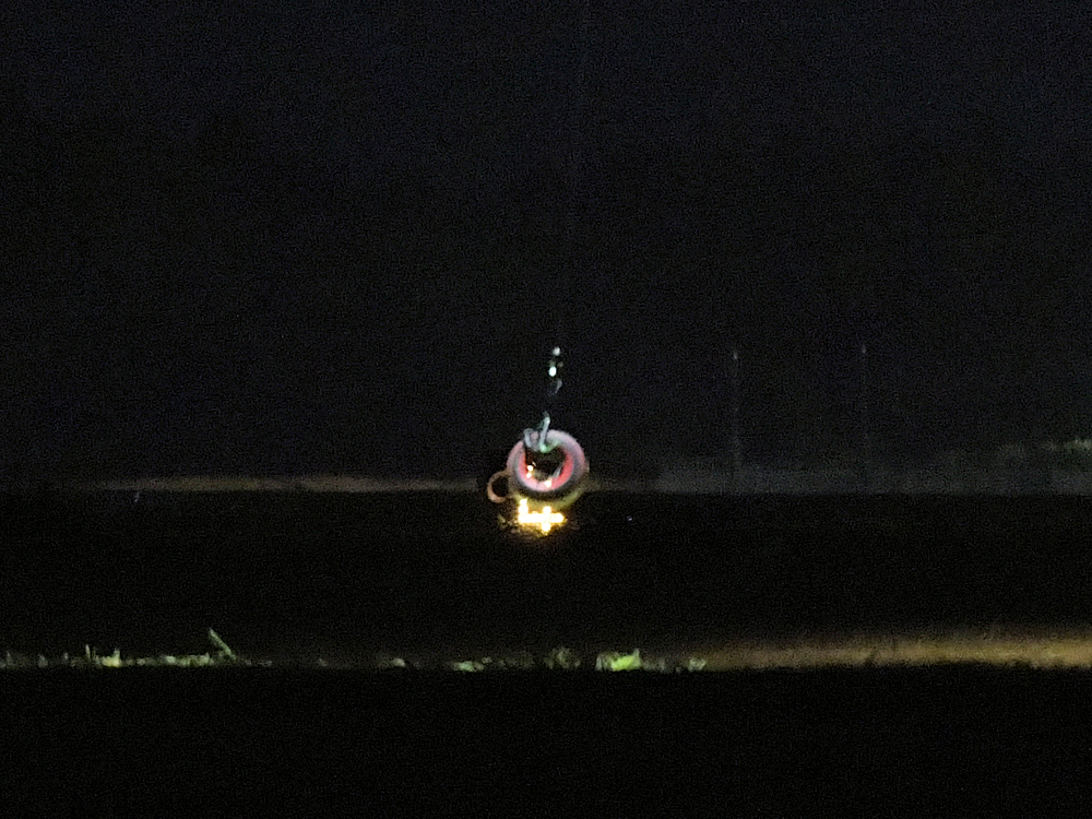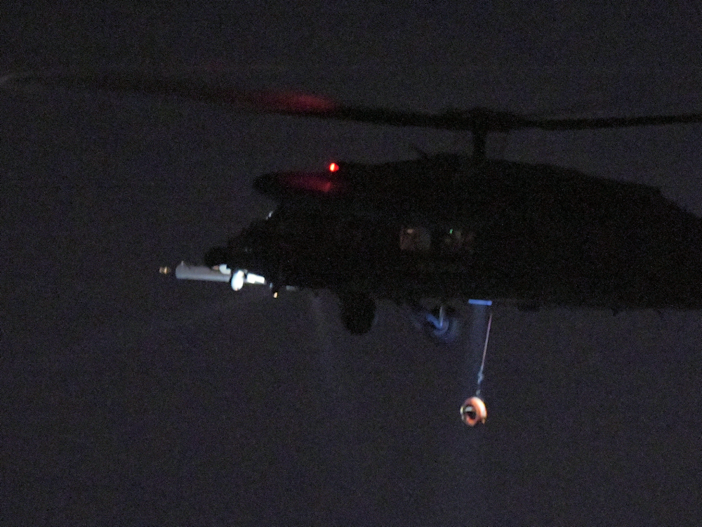 高度を上げ、ホイストからワイヤーを降ろし、しばし、地表を探っていると、ナント、タイヤが釣れました。先に降ろしたタイヤを再度釣りあげたようです。
