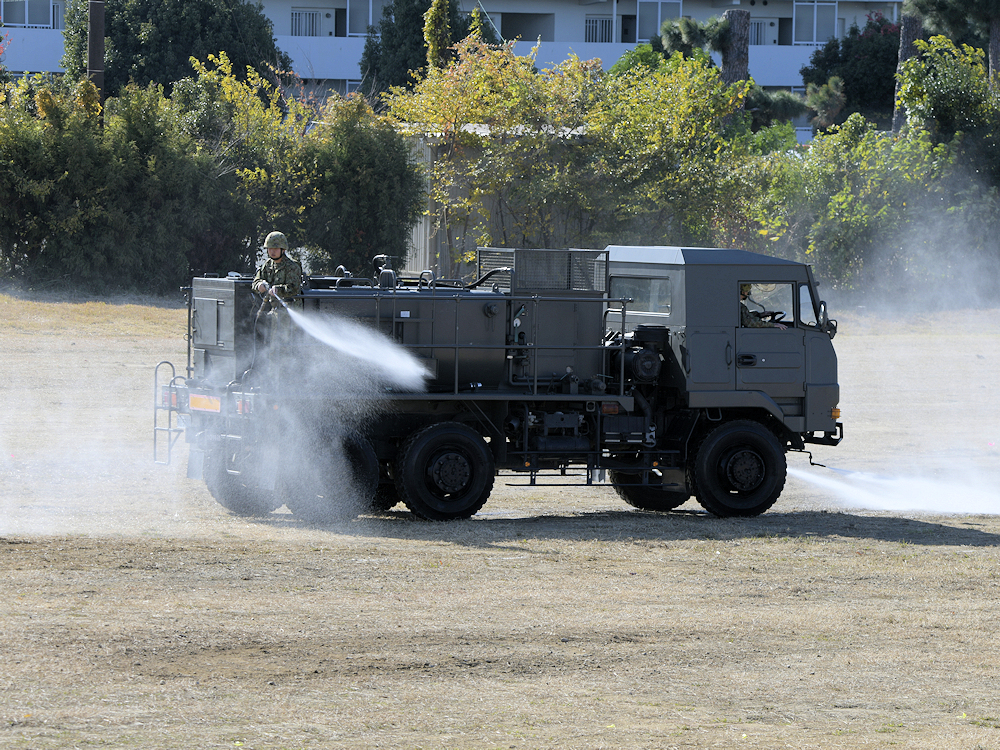 多数の車両が機動するので、土埃を抑えるため、除染車で散水。