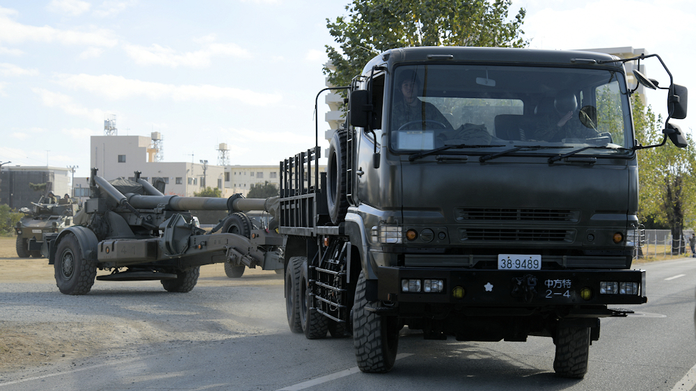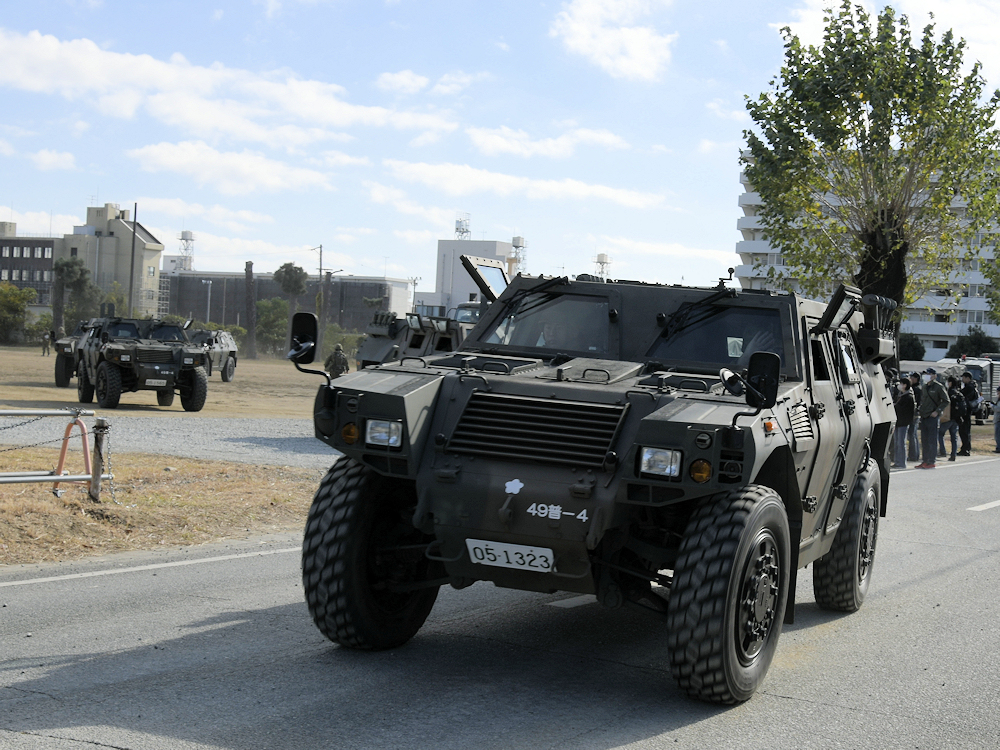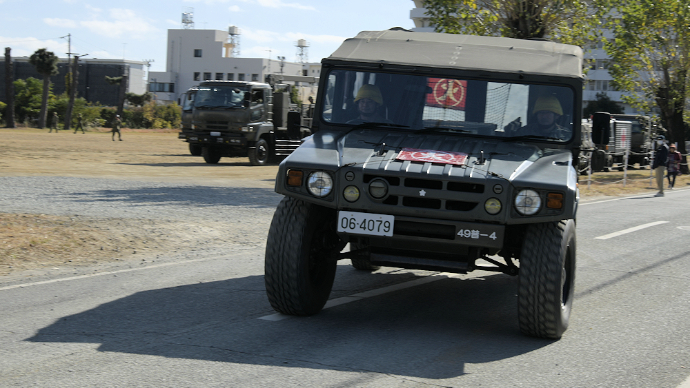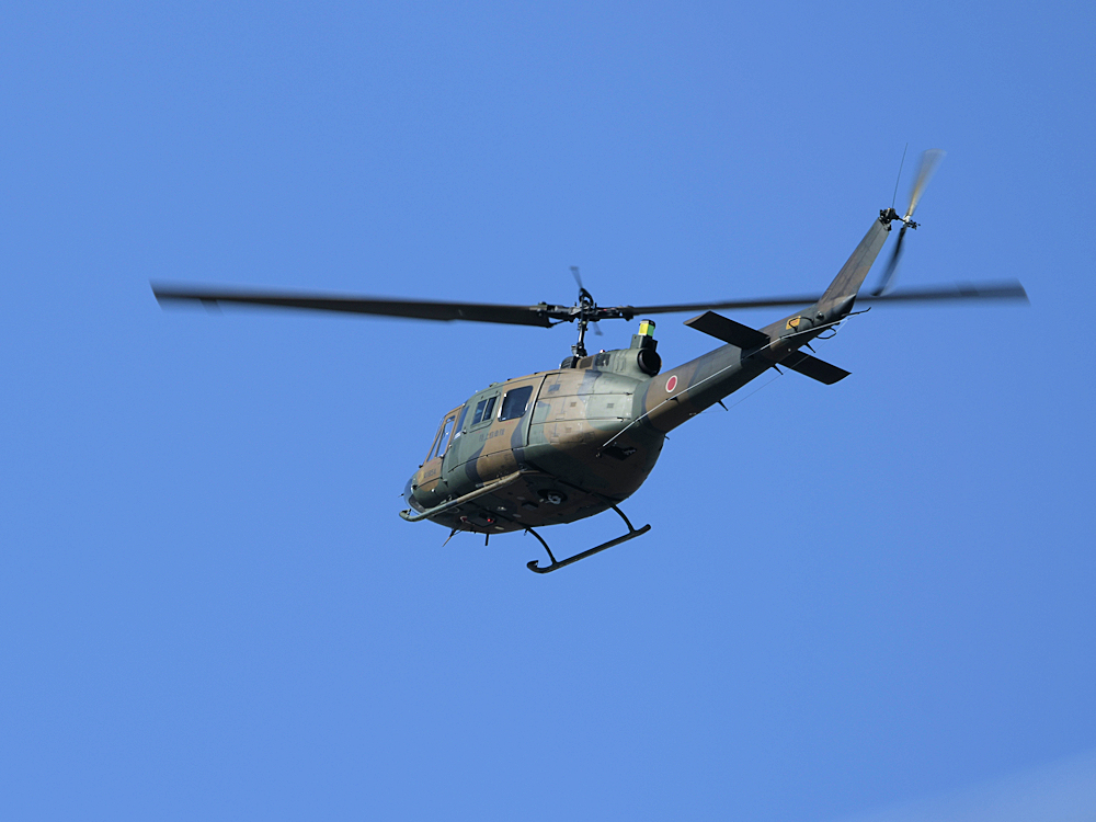 グランドでの行事が終了し、UH-1Jが明野駐屯地へ帰投。行事に参加していた車両も公道を通って駐屯地に戻ります。 |