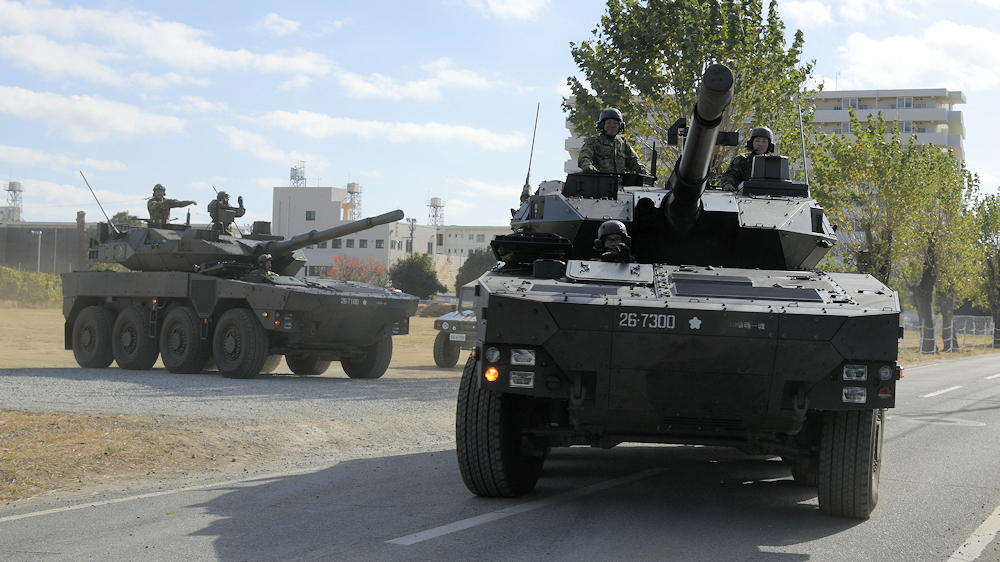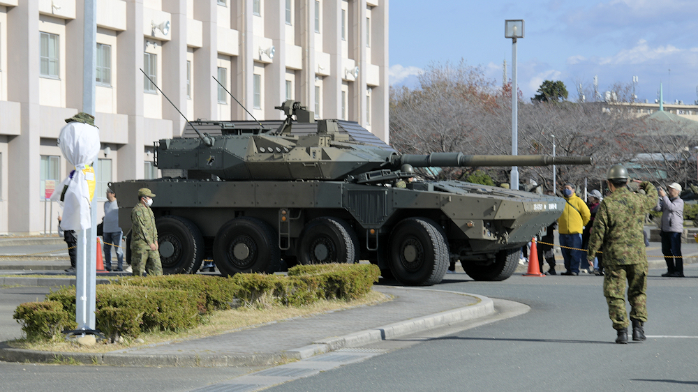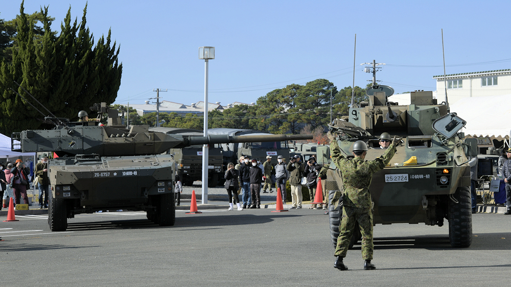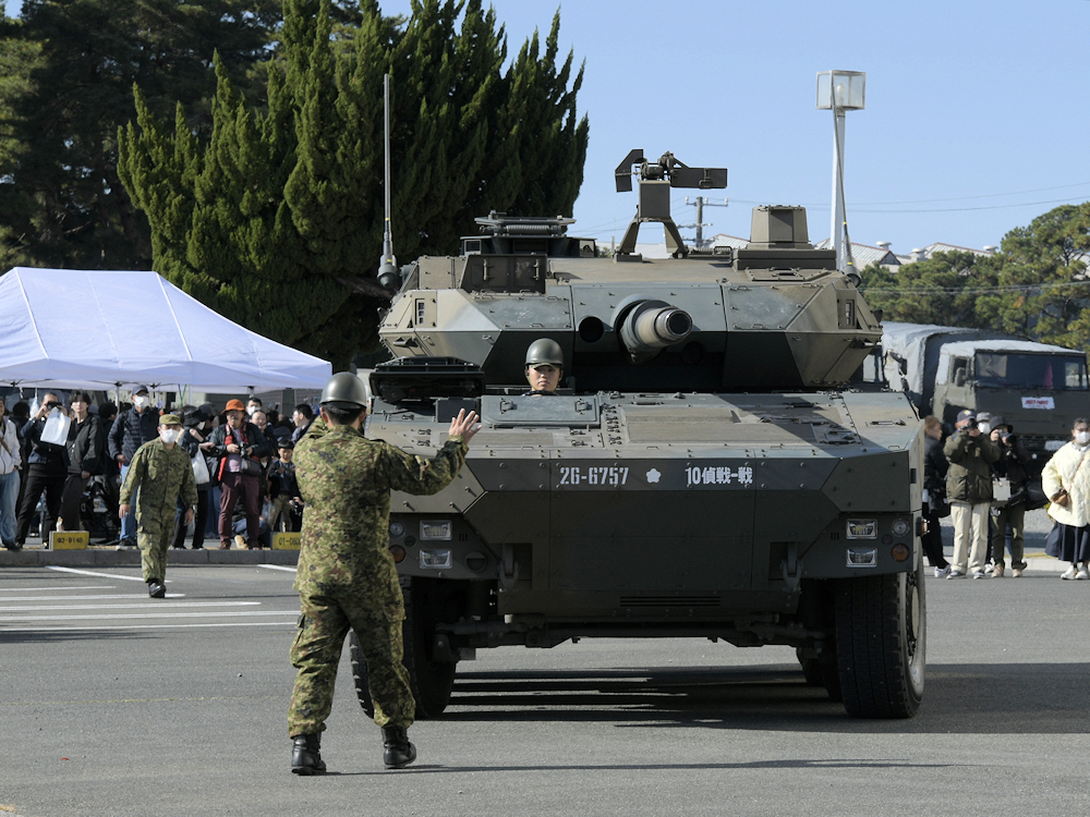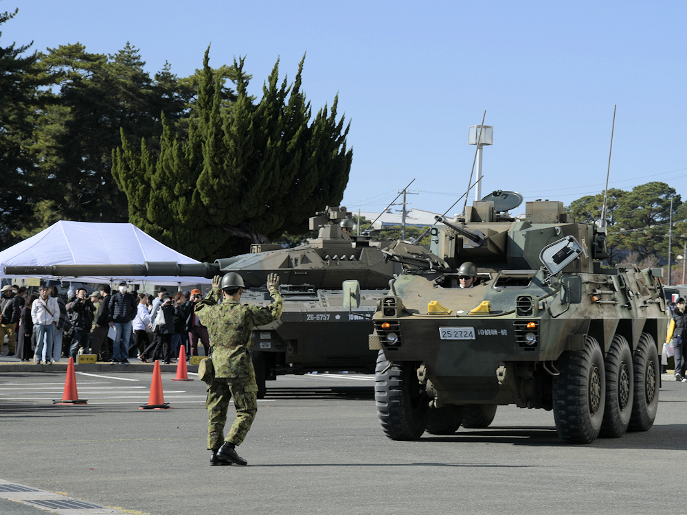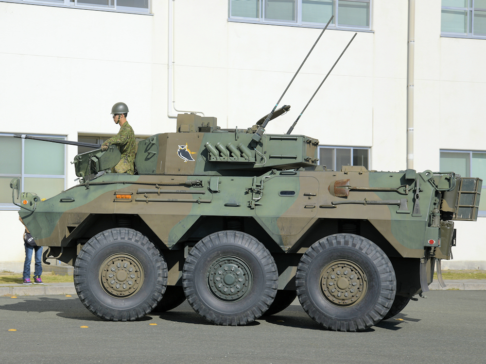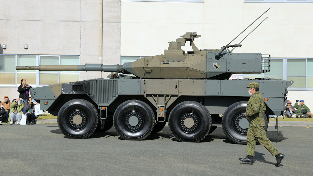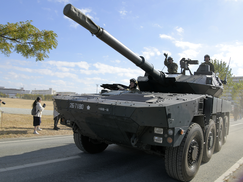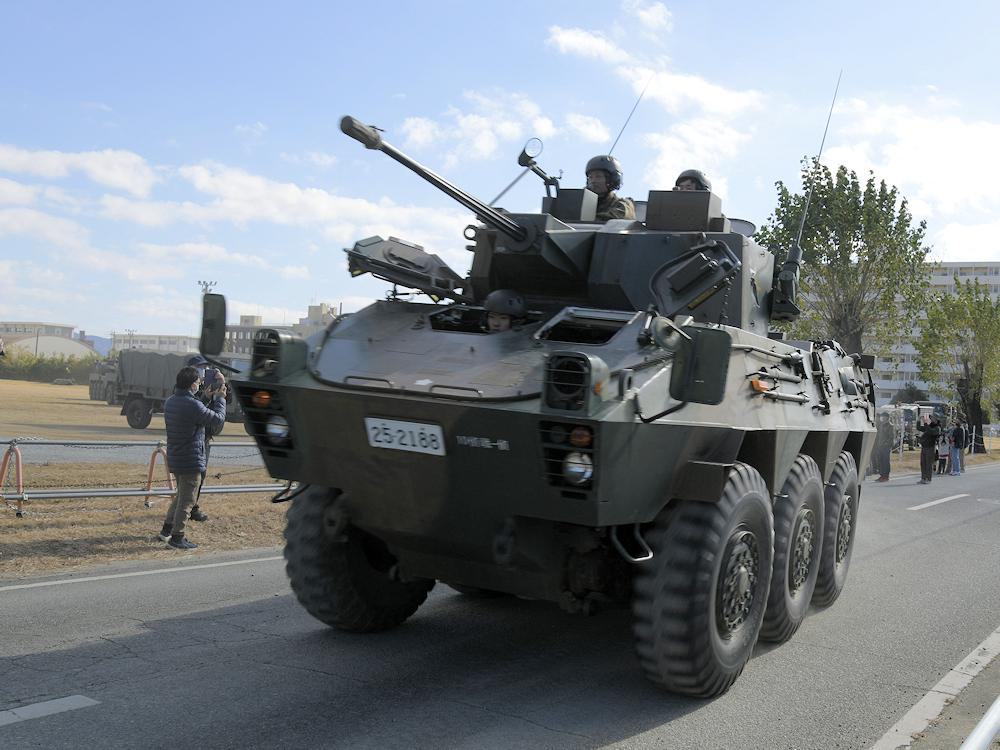 配置についた16式機動戦闘車は、砲塔を旋回させ、なにげに動態展示も。 |