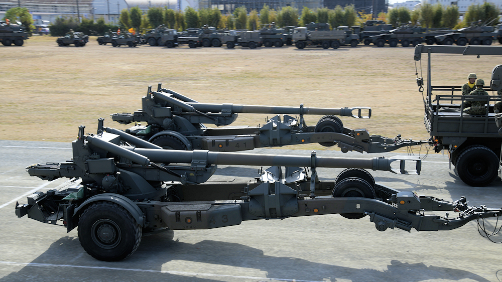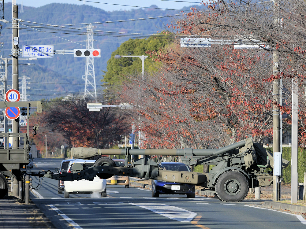 快晴の豊川駐屯地創立記念行事。式典や訓練展示はグランドで行われますが。駐屯地とグランドの間には公道があります。朝は早くから開場待ちをしていると、駐屯地から道路を渡って、火砲や装甲車両が移動するのを見ることができます。 |
