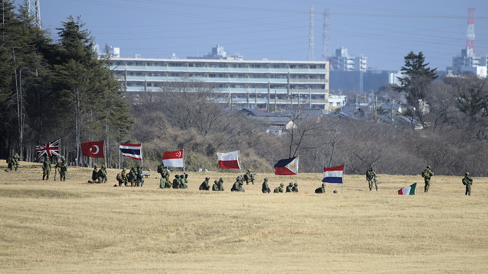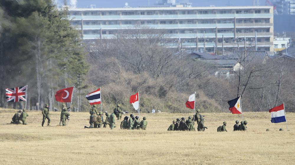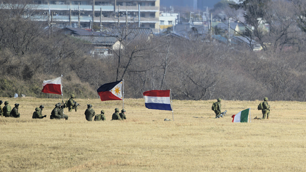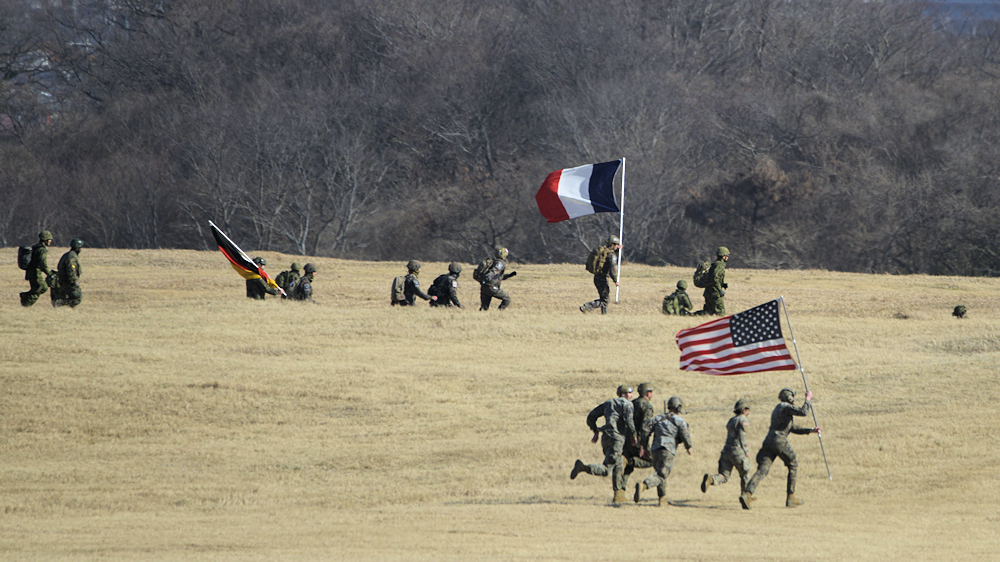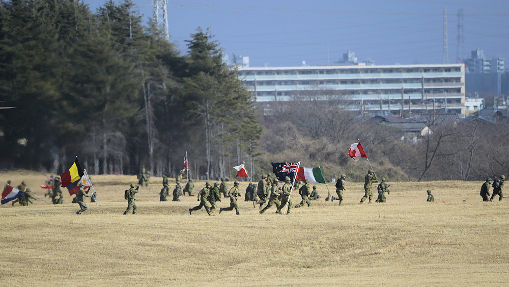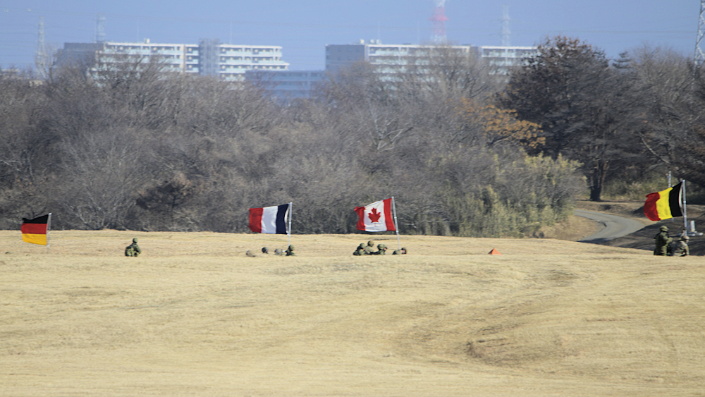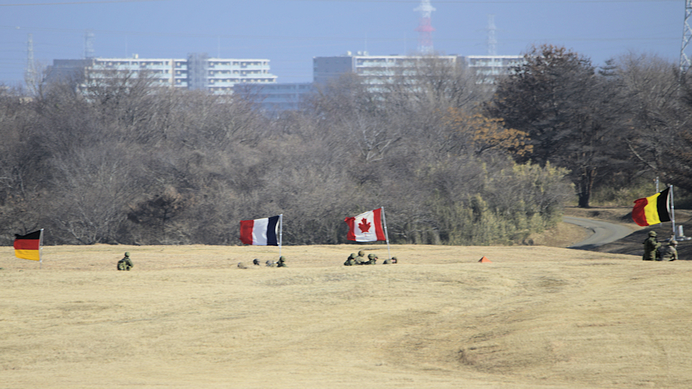強風で空挺降下は中止となりましたが、おかげで国旗がきれいに風になびき、なかなか画になります。