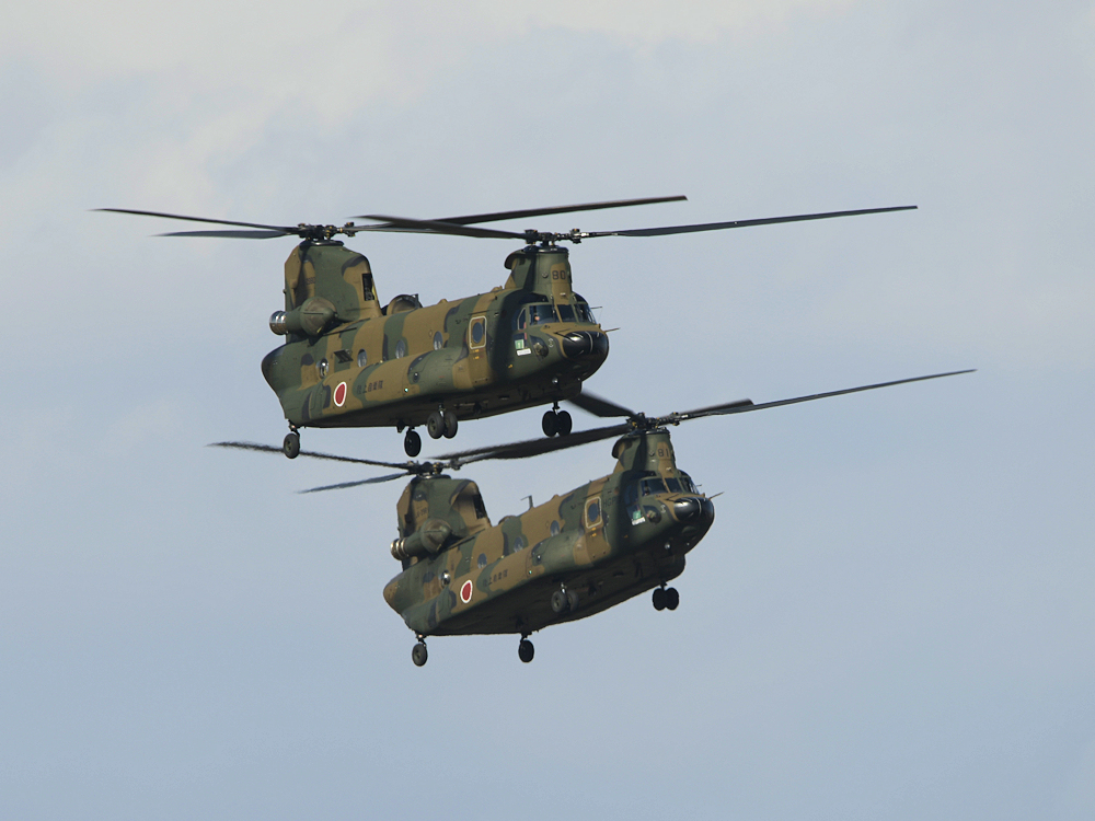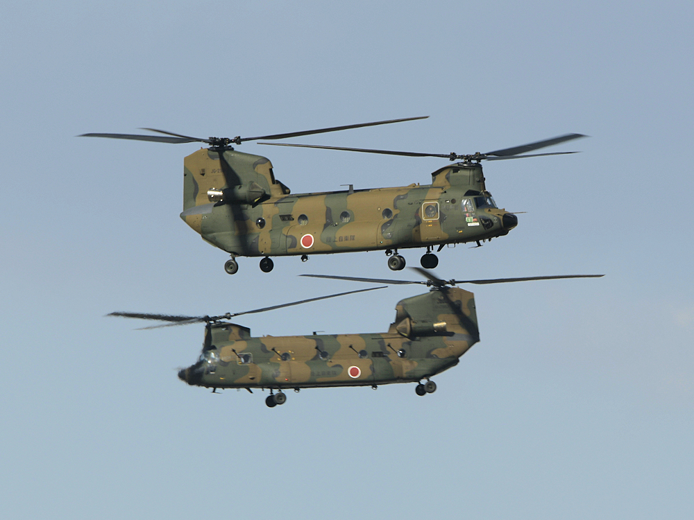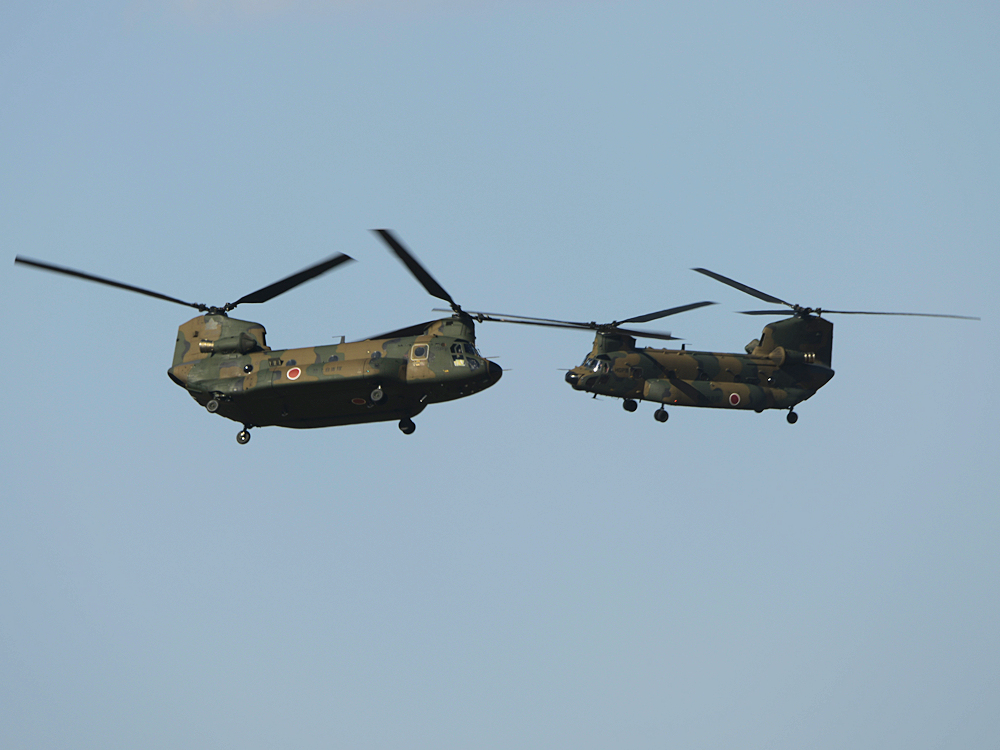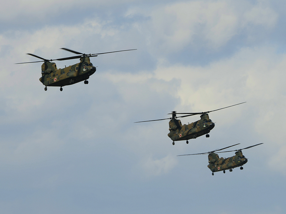 展示もいよいよ終盤。ようやく陽がさしてきました。待機していたCH-47が次々と演習場に降着。国旗を掲げた空挺隊員たちが駆け降ります。 |