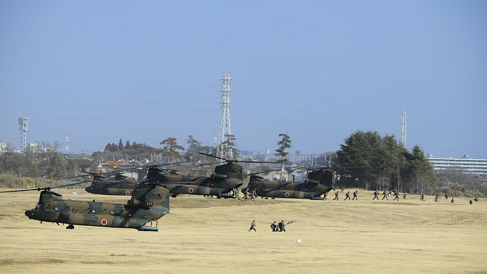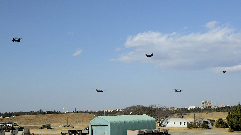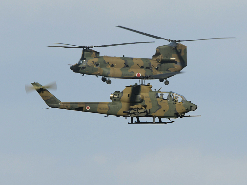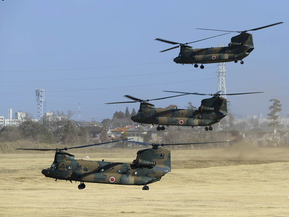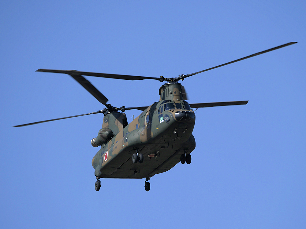展示もいよいよ終盤。ようやく陽がさしてきました。待機していたCH-47が次々と演習場に降着。国旗を掲げた空挺隊員たちが駆け降ります。 |