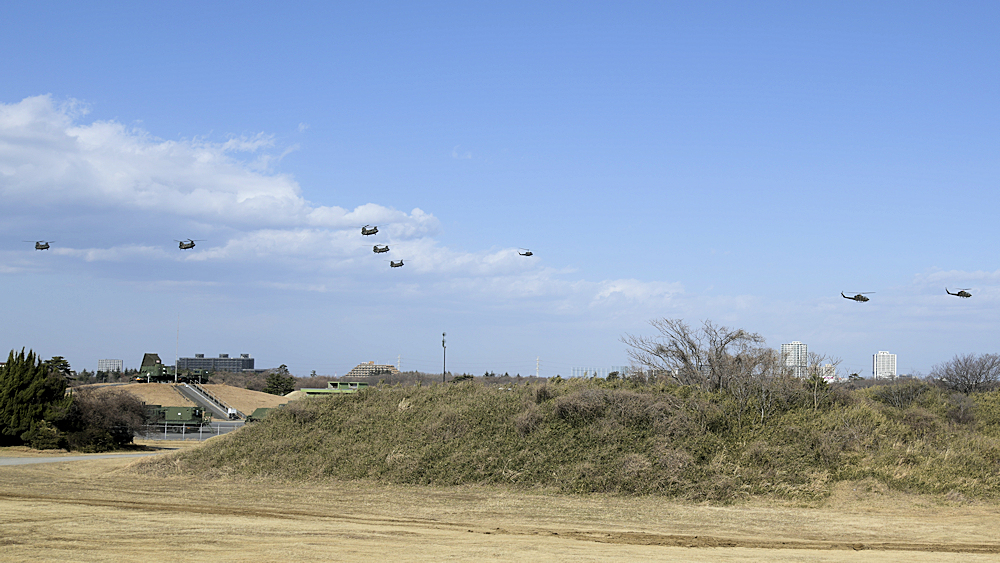 その間にヘリ部隊は旋回しつつ、最後の航過飛行のための編隊を組みます。 |