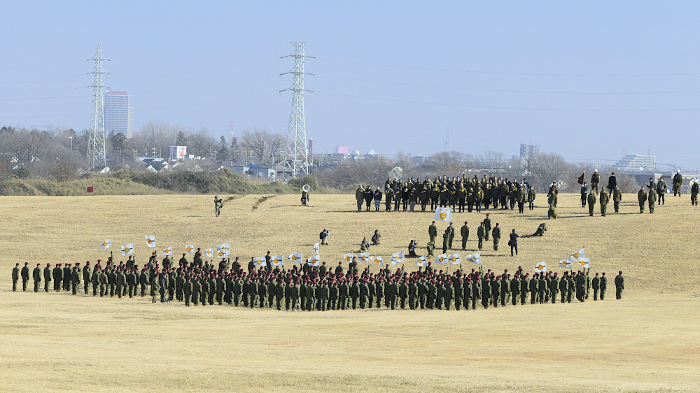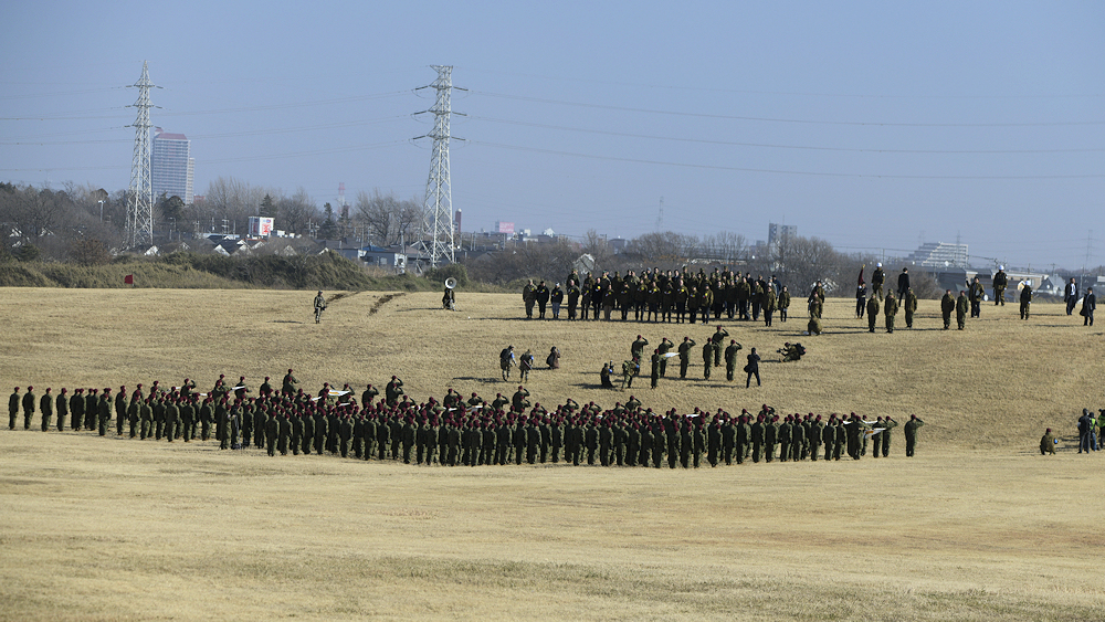 演習状況終了! ヘリ部隊が上空を編隊航過し、隊員さんや来賓の方々は防衛大臣の訓示を受けるために集合します。 |