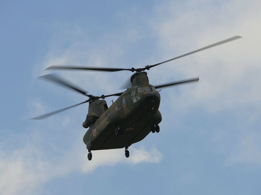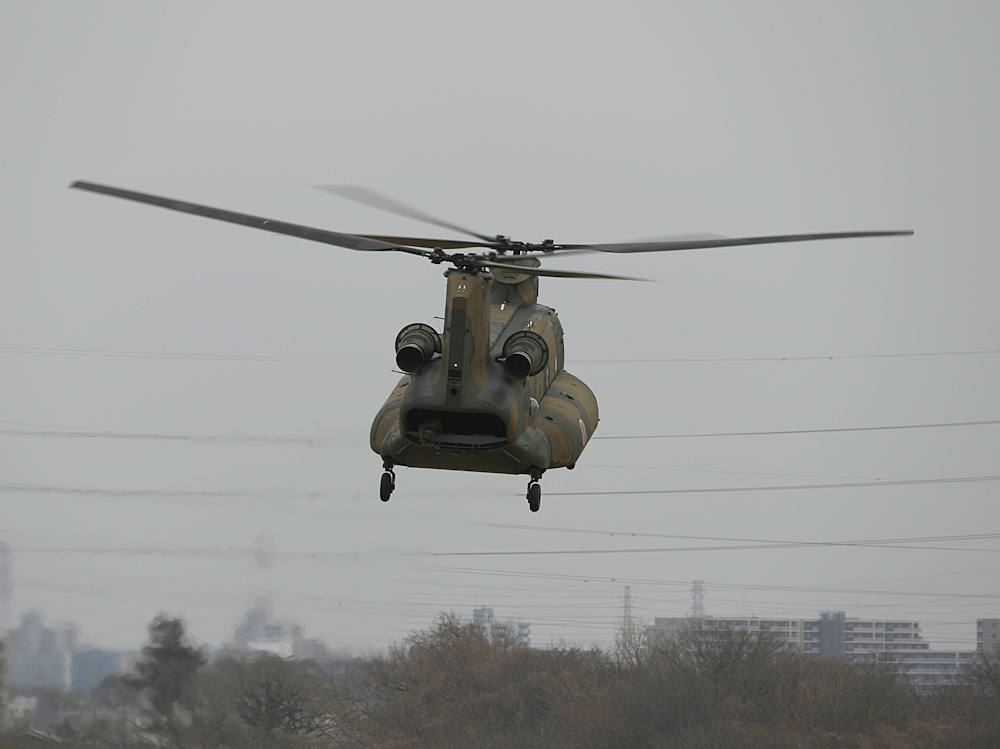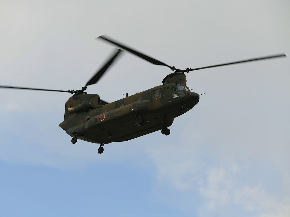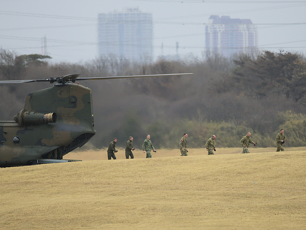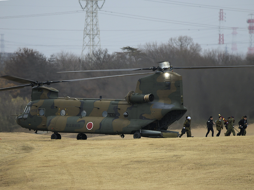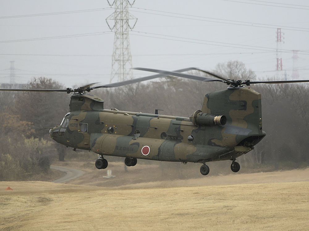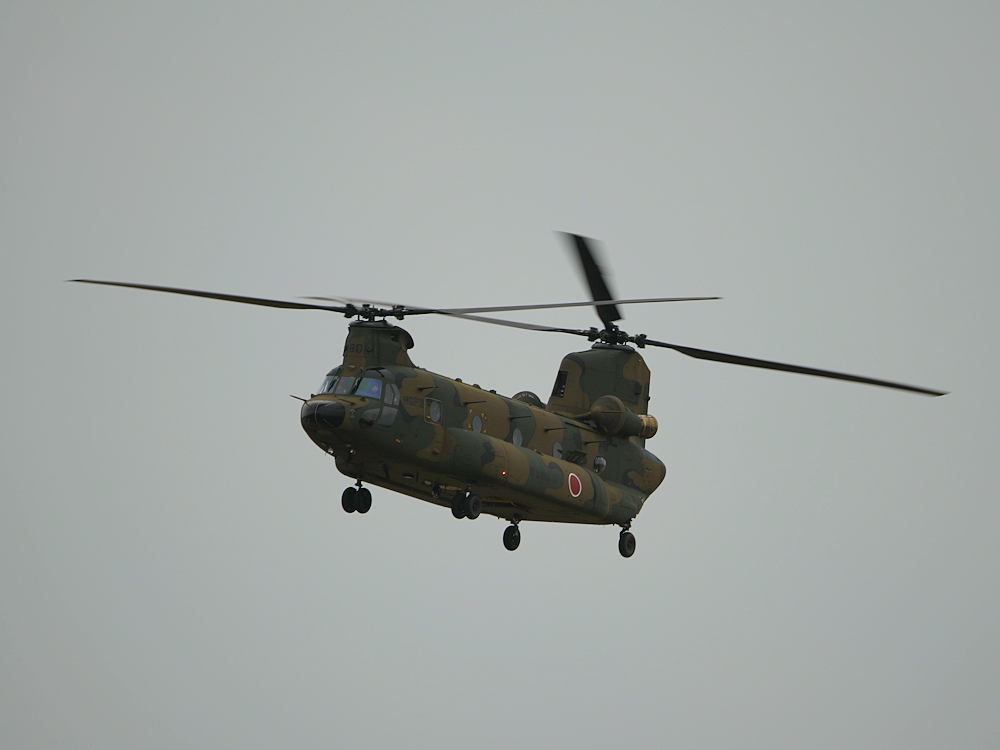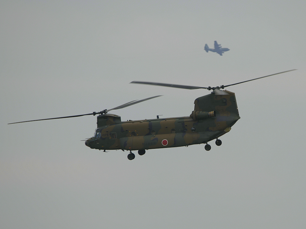 VIPを降ろした後、待機位置に戻るCH-47の向こうには出番待ちの空自C-130Hがみえます。