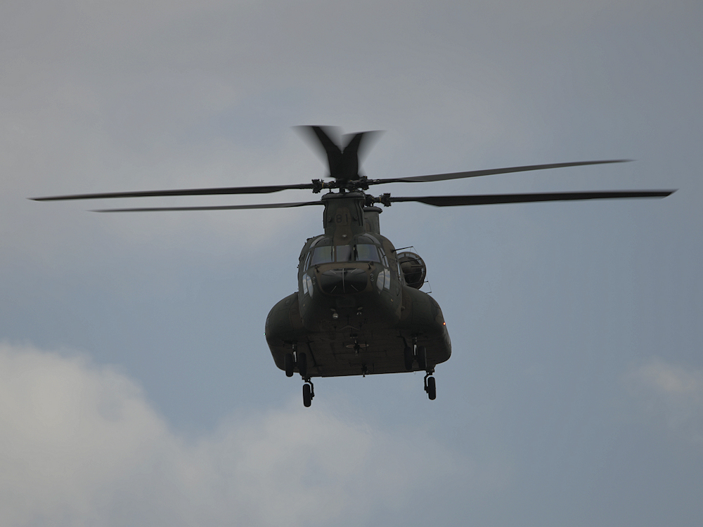 本来なら上空から空挺降下を視察するはずだった参加国のVIPを乗せたCH-47が観閲台に降りてきます。