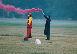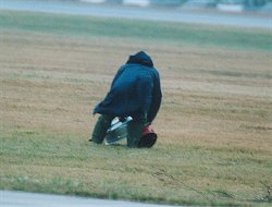 低空を飛ぶV-107の風圧でバケツとたらいが吹き飛ばされてしまいました。